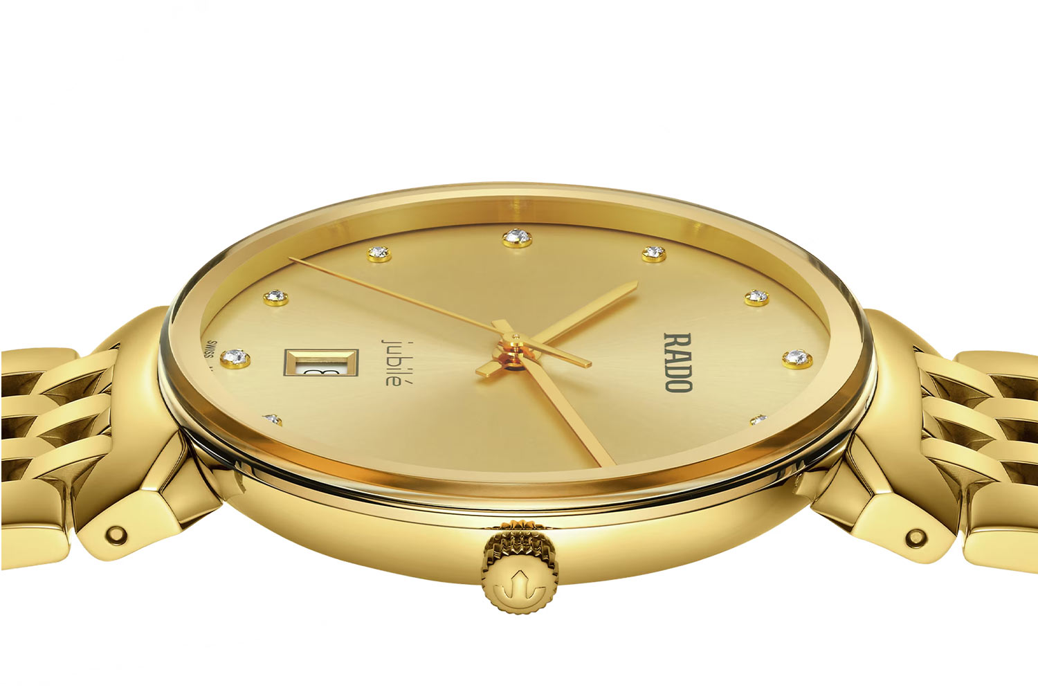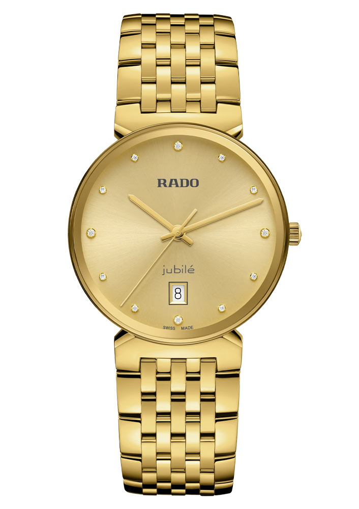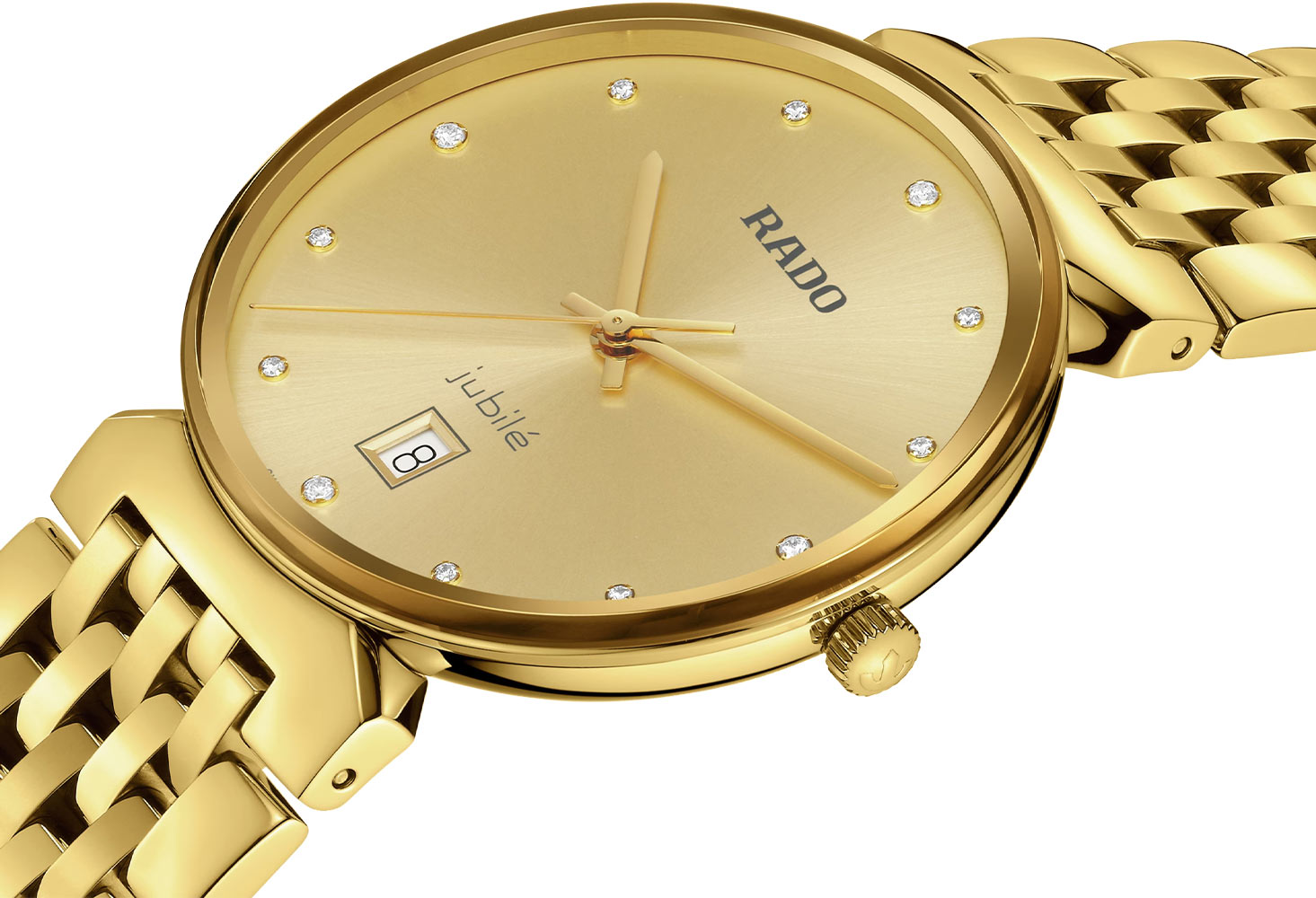 Pánské hodinky Rado Florence mají kulaté ocelové pouzdro ve zlatém PVD o velikosti 38 mm. Na pravé straně je pozlacená korunka s logem značky v podobě kotvy. Toto krásně leštěné pouzdro hodinek Rado Florence je kombinováno s elegantním náramkem, který je navíc pozlacený. Je vybavena motýlkovou sponou, která je bezpečná a pohodlná při používání. Náramkové hodinky Rado jsou zepředu chráněny zkoseným a zakřiveným, kvalitním safírovým sklíčkem. Pokrývá celý povrch pouzdra a chrání nádherný ciferník s dvanácti pravými diamanty. Tento ciferník se pyšní zlatou barvou, která se díky slunečnímu brusu krásně leskne. Fenomenální diamanty jsou nastaveny na celé hodiny. Aktuální čas ukazují pozlacené ručičky. Aktuální den v měsíci je indikován ukazatelem data umístěným na 6. hodině. Nápis Jubilé nám připomíná šperkový charakter hodinek Rado z kolekce Florence Diamonds Gents.