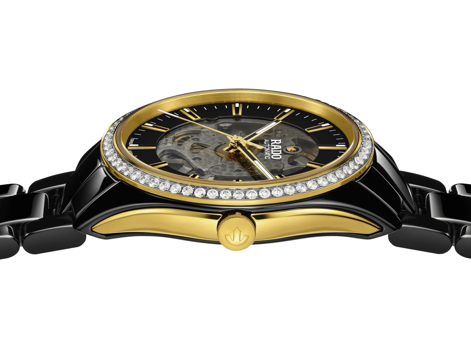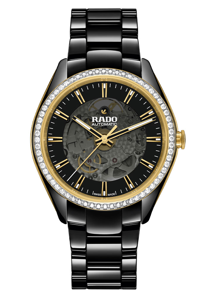 Přední strana hodinek je chráněna nejkvalitnějším safírovým sklíčkem, mírně zakouřeným pro vizuální efekt. Černý, převážně skeletový ciferník zdobí elegantní, pozlacené indexy s vrstvou černého matu. Značkovače i ručičky jsou vybaveny luminiscencí Super-LumiNova®, která usnadňuje odečítání času i při slabém osvětlení. Hodinářské nadšence jistě potěší možnost obdivovat práci vystaveného automatického mechanismu Rado. Tento přesný strojek poskytuje rezervu chodu až 80 hodin a jeho přesnost a bezpečnost zajišťuje vlasová pružina Nivachron™, odolná vůči magnetickým polím a vysokým teplotám.