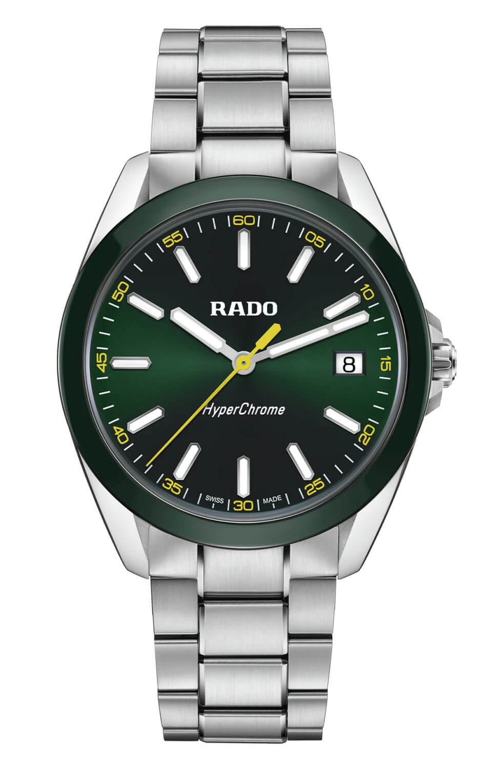 Zelený ciferník s gradientním efektem je zvýrazněn žlutými akcenty a kontrastními ručkami, které zajišťují výbornou čitelnost. Okénko s datem na třetí hodině a přesně nanesené indexy podtrhují funkčnost designu. Uvnitř pracuje švýcarský quartzový strojek Rado, který kombinuje spolehlivost s bezúdržbovým provozem. Tento sportovní model si zachovává vytříbený styl, aniž by rezignoval na praktické vlastnosti. Hodinky Rado HyperChrome R32280313 na náramku představují moderní časoměřič, který spojuje styl, odolnost a technologickou vyspělost v jednom soudržném celku.