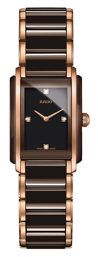Dámské švýcarské hodinky Rado Integral Diamonds vyrobené z nerezové oceli a High-Tech Ceramic v hnědé barvě. Ve středu náramku a na boku pouzdra byly použity nejkvalitnější keramické sintry. Na ciferníku byly zasazeny diamanty, což je charakteristické pro hodinky Rado ze série Jubile.