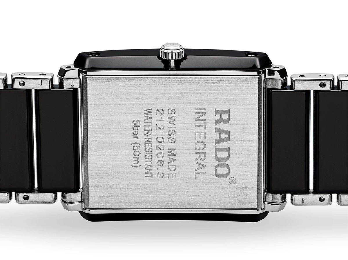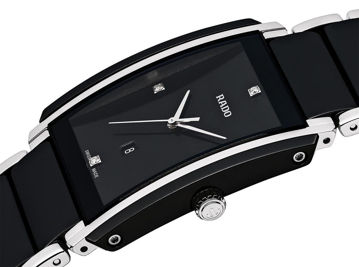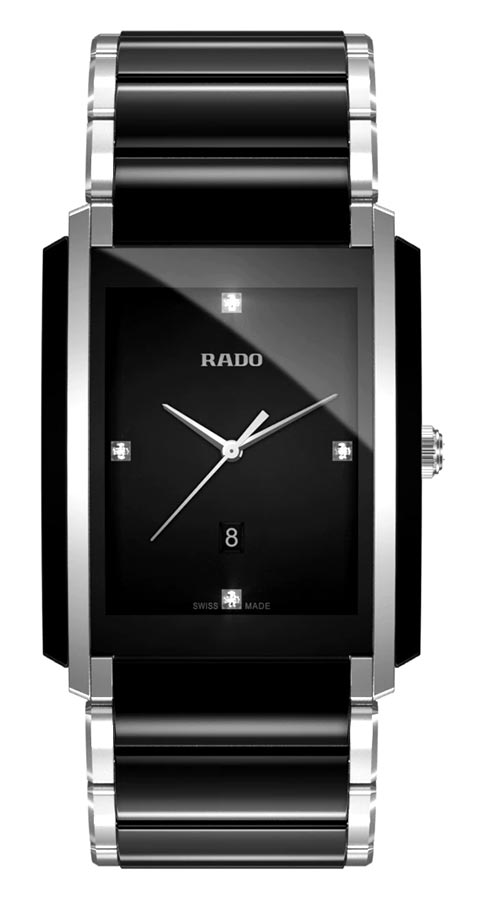 Švýcarské pánské hodinky Rado Integral Diamonds vyrobené z nerezové oceli a High-Tech Ceramic v černé barvě. Ve středu náramku a na boku pouzdra byly použity nejkvalitnější keramické sintry. Na ciferníku byly zasazeny diamanty, což je charakteristické pro hodinky Rado ze série Jubile.