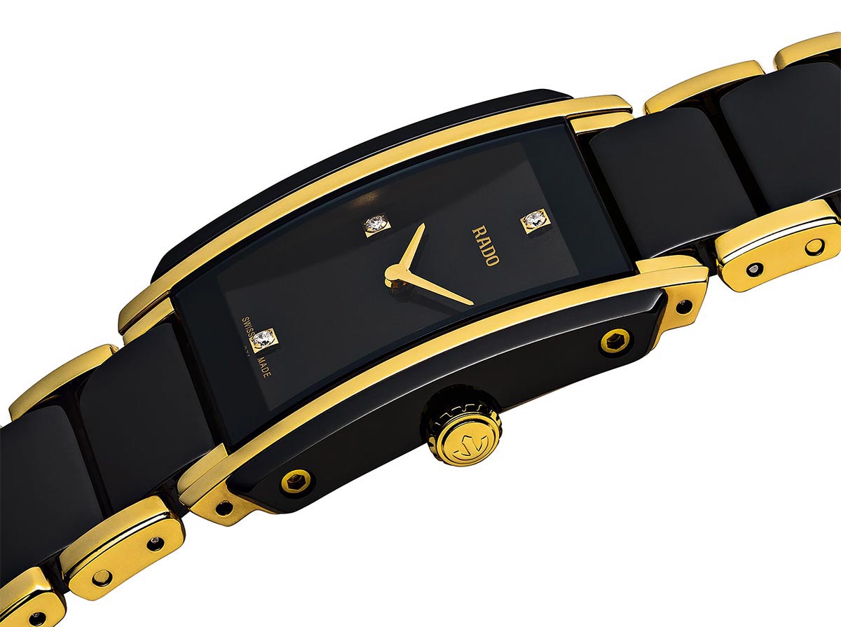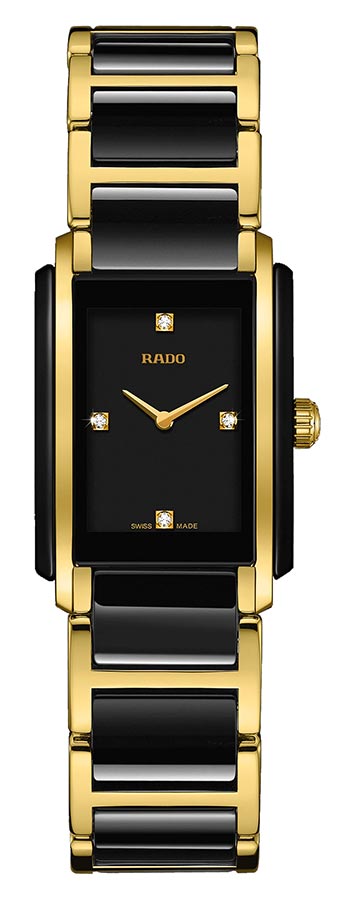 Dámské švýcarské hodinky Rado Integral Diamonds vyrobené z nerezové oceli a High-Tech Ceramic v černé barvě. Ve středu náramku a na boku pouzdra byly použity nejkvalitnější keramické sintry. Na pouzdru a ciferníku jsou zasazeny diamanty, což je charakteristické pro hodinky Rado ze série Jubile.