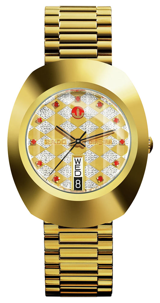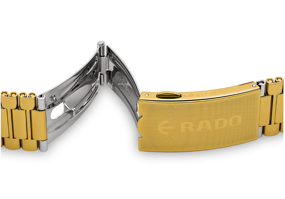 Neméně působivý a jedinečný je i ciferník hodinek Rado R12413193, který je téměř celý osazen drahými kameny a tam, kde drahé kameny nejsou, jsou elegantní geometrické vložky ve zlaté barvě. Bohatá přítomnost diamantů Top Wesselton dělá z tohoto ciferníku opravdovou korunku. Jejich vytříbený design odráží první modely DiaStar, které jsou poctěny svým logem ve 3 hodiny.Jsou to dokonalé hodinky pro znalce osobitého stylu, vysoké hodnoty a luxusní kvality. Královský ciferník je chráněn safírovým sklem vysoce odolným proti poškrábání s antireflexní vrstvou. Oválné pouzdro o průměru 35 mm a tloušťce 11,9 mm je zavěšeno na třířadém náramku z nerezové oceli 316L ve žlutém PVD. Celek pohání spolehlivý švýcarský automatický Machineek s funkcí prodlouženého data a rozsáhlou rezervou chodu až 80 hodin .