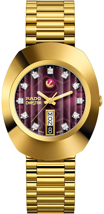 Hodinky Rado Original Automatic R12413573 jsou reinterpretací ikonického modelu Rado Original. Současná časomíra odkazuje na hodinky před lety nejen tvarem pouzdra, ale především stejným ciferníkem jako model DiaStar z roku 1962 . Original se vyznačuje klasickým designem Rado v kombinaci s nejnovějšími vysoce výkonnými materiály. Ikona z minulosti, přepracovaná pro dnešní muže, kteří chtějí vyniknout jedinečnými hodinkami. Před pěti desítkami let způsobil Rado revoluci v hodinářství se svými ikonickými hodinkami odolnými proti poškrábání. Dnes Rado Original spojuje odvážný a nadčasový design svého předka jako opravdová klasika, nesoucí nezaměnitelný podpis působivé konstrukce pevného pouzdra. Jeho design je veskrze moderní a má výrazný sportovní nádech. V roce 1962 představila společnost Rado ikonické hodinky Rado DiaStar 1 odolné proti poškrábání, tedy v době, kdy to zdaleka nebylo běžné. Tajemství tohoto tvora? tvrdý kov. Materiál Hardmetal použitý v těchto hodinkách je extrémně robustní – pevnější než ocel, zlato a platina, extrémně odolný proti poškrábání a schopný odolat úskalím každodenního života. Charakteristický tvar pouzdra má průměr 35 mm, jeho delší část má průměr 42,50 mm a tloušťka celé konstrukce je 11,90 mm. Zvláště pozoruhodný je ciferník zdobený zajímavým vzorem s lesklými 11 drahokamy. Ciferník je fialové barvy a dokonale ladí s celkem, který byl pozlacený žlutým zlatem metodou PVD.
