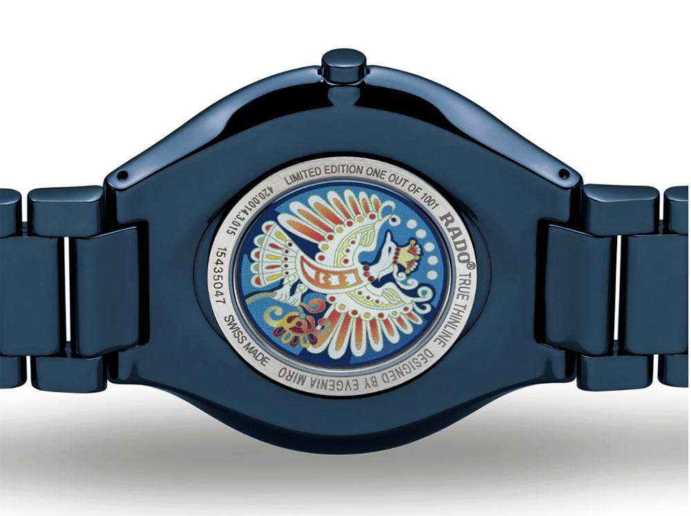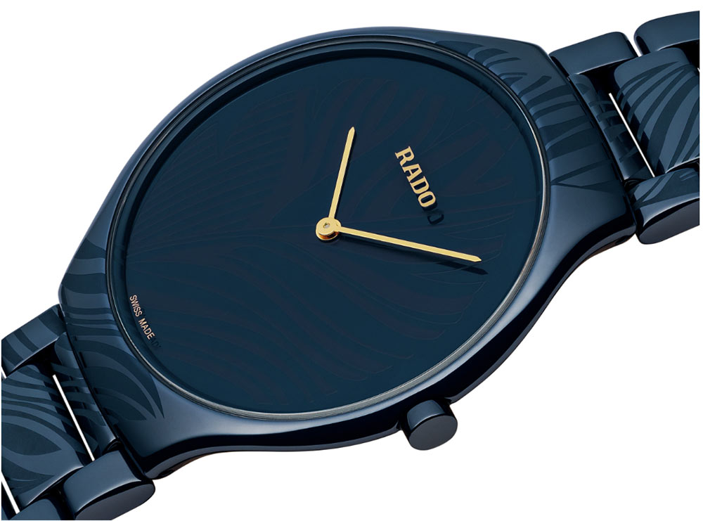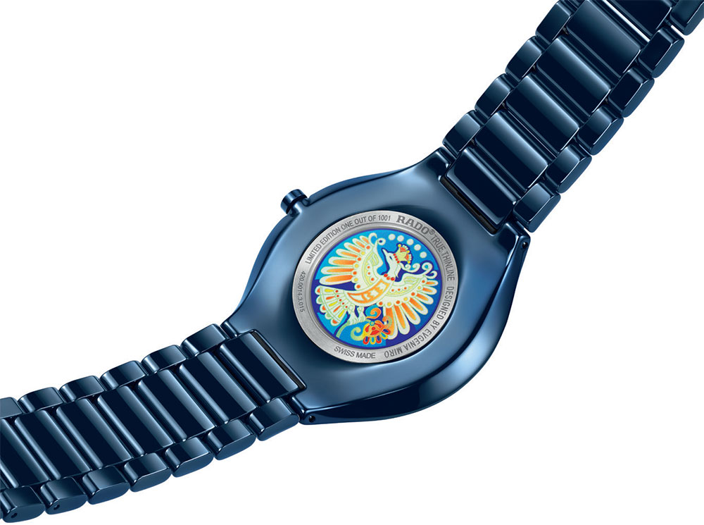 Rado True Thinline My Bird Limited Edition R27014152 je Limited Edition, pouze 1001 kusů po celém světě, která využívá různé průkopnické materiálové techniky k vytvoření jednoho krásného, harmonického hodinky. Sytá, hluboká modrá na high-tech keramickém pouzdře a náramku je sytá barva, kterou představuje většina prací ruského designéra Evgeni Miro. Design peříček je na hodinkách vyryt laserem a pokračuje ciferníkem symbolizujícím jedinečnou filozofii času. Jedním z klíčových témat Evgeniho tvorby je čas a je známá tím, že používá různé materiály, včetně hedvábí a jemného porcelánu. Designér měl poprvé to potěšení pracovat s keramikou Rado High-Tech, společně se švýcarskou značkou vytvořili hodinky s tloušťkou pouzdra pouhých 5 milimetrů. True Thinline nastavuje nové standardy pro lehkost a pohodlí a stávají se nejtenčími keramickými hodinkami na světě. Švýcarští průkopníci moderního hodinářství, známí používáním neobvyklých, high-tech materiálů k vytvoření tohoto kusu technologie hraničící s uměním, překročili mnoho hranic. Rado True Thinline kombinuje vlastnosti vynikající odolnosti a nebývalého komfortu používání.