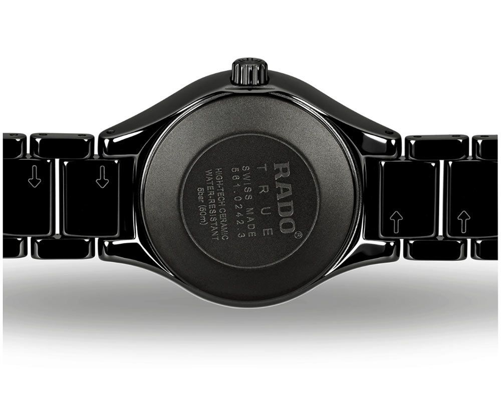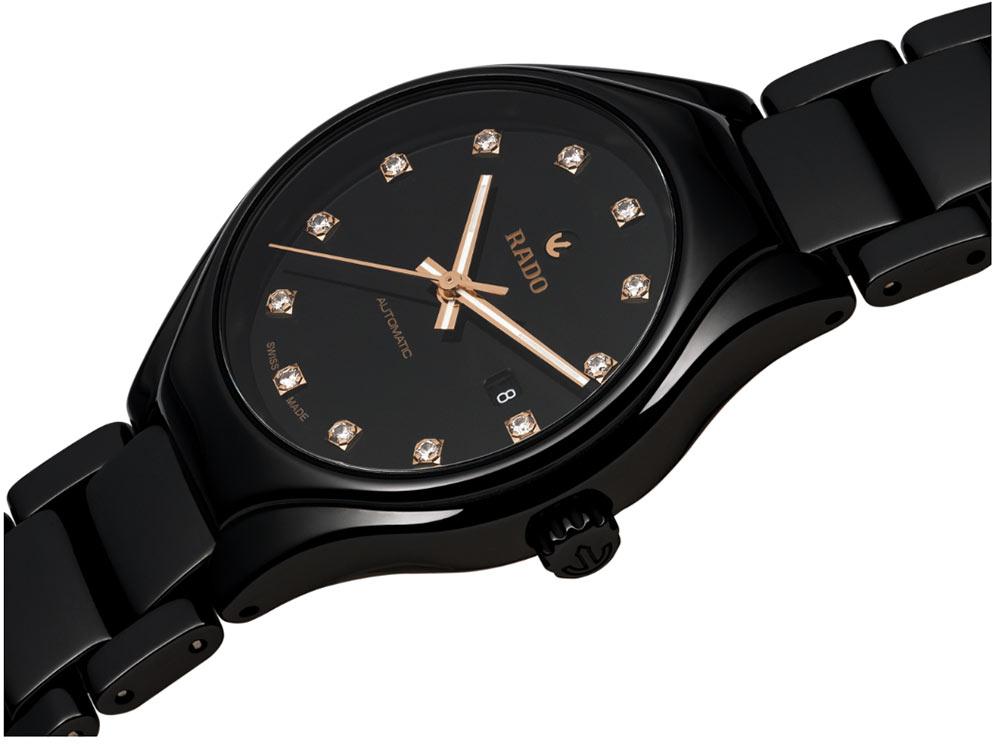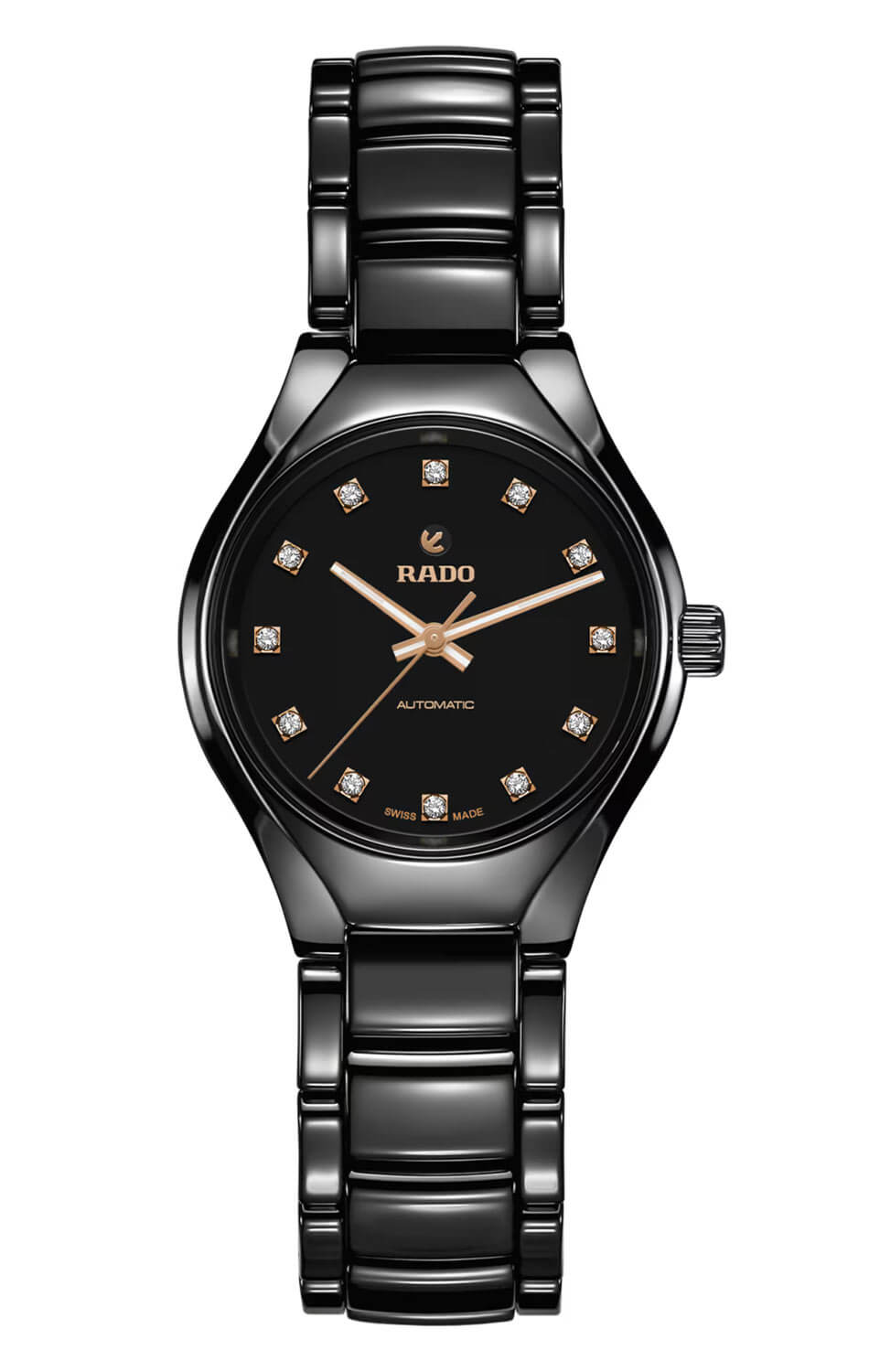 Rado True - dnešní pohled na hodinky s klasickým kulatým pouzdrem. Nové hodinky z kolekce Rado True Lady s moderním nádechem. Osm let po výrobě oceňované kolekce True jsou tyto mimořádné hodinky zpět s novým vzhledem. S poutavým pouzdrem a náramkem vyrobeným z černé High-Tech Ceramic, titanovou sponou náramku a elegantním, a přesto snadno čitelným číselníkem je Rado True lehký, pohodlný na nošení a poutavý. Rado True Automatic Lady má automatický mechanismus.