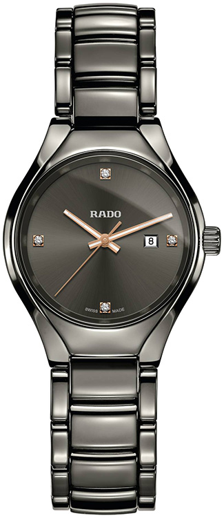 Dámské hodinky Rado True Diamonds Lady R27060712 111.0060.3.071 - dnešní pohled na hodinky s klasickým kulatým pouzdrem. Hodinky z kolekce Rado True Lady s moderním nádechem. Osm let po výrobě oceňované kolekce True se tyto mimořádné hodinky vrací s novým vzhledem. S poutavým keramickým pouzdrem a náramkem Plasma High-Tech, titanovou sponou náramku a elegantním, ale snadno čitelným číselníkem je Rado True lehký, pohodlný na nošení a poutavý.