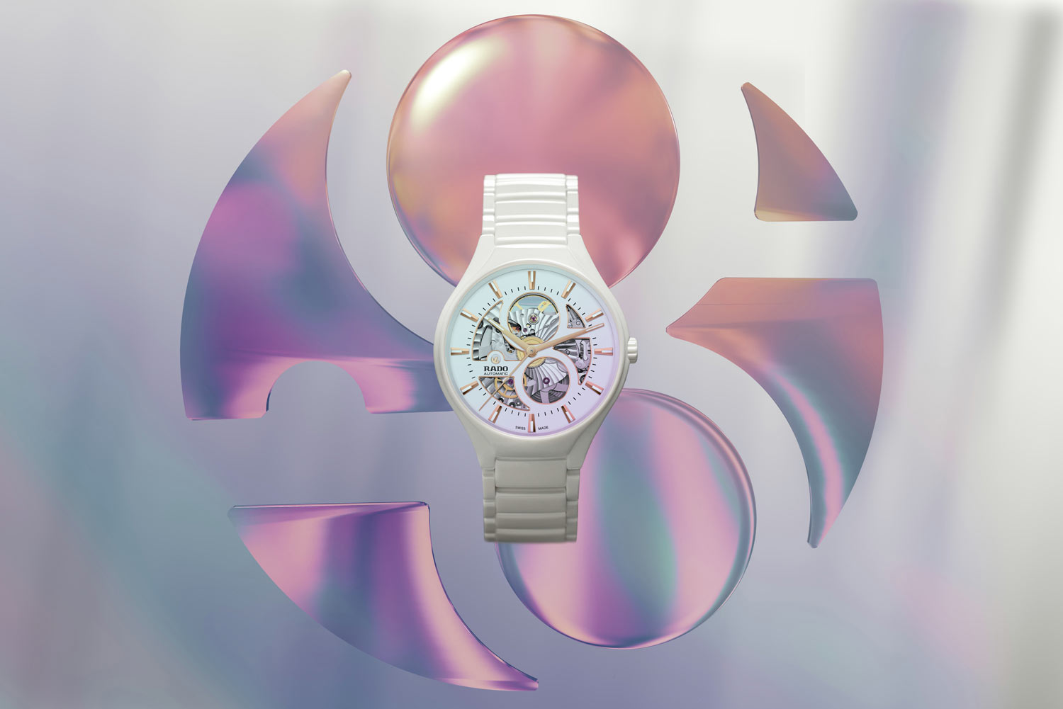 Přední strana skeletových hodinek Rado je chráněna safírovým sklem odolným proti poškrábání. Sklo kryje skeletový číselník, díky kterému můžete obdivovat mechanismus. Majitel tohoto limitovaného modelu může pozorovat složité pohyby automatického Rado kalibru R734, který nabízí rezervu chodu až 80 hodin. Tento unikátní strojek je vybaven speciální silikonovou pružinou Nivachron™, která ochrání systém před magnetizací a vyššími teplotami. Prezentované náramkové hodinky Rado se pyšní rafinovanými detaily. Kontrast bílého slunečního ciferníku a zkoseného okraje v růžovém zlatě, stejně jako indexy pokryté bílou vrstvou Super-LumiNova®, vytváří harmonickou kompozici elegance a funkčnosti.