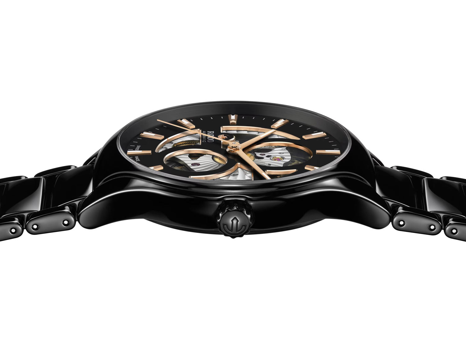 Přední strana skeletových hodinek Rado je chráněna safírovým sklem odolným proti poškrábání. Sklo kryje skeletový číselník, díky kterému můžete obdivovat mechanismus. Majitel tohoto švýcarského modelu může pozorovat složité pohyby automatického kalibru Rado R734, který nabízí rezervu chodu až 80 hodin. Tento unikátní strojek je vybaven speciální silikonovou pružinou Nivachron™, která ochrání systém před magnetizací a vyššími teplotami. Prezentované náramkové hodinky Rado se pyšní rafinovanými detaily. Kontrast černého slunečního ciferníku a zkoseného okraje v růžovém zlatě, stejně jako indexy pokryté bílou vrstvou Super-LumiNova®, vytváří harmonickou kompozici elegance a funkčnosti.