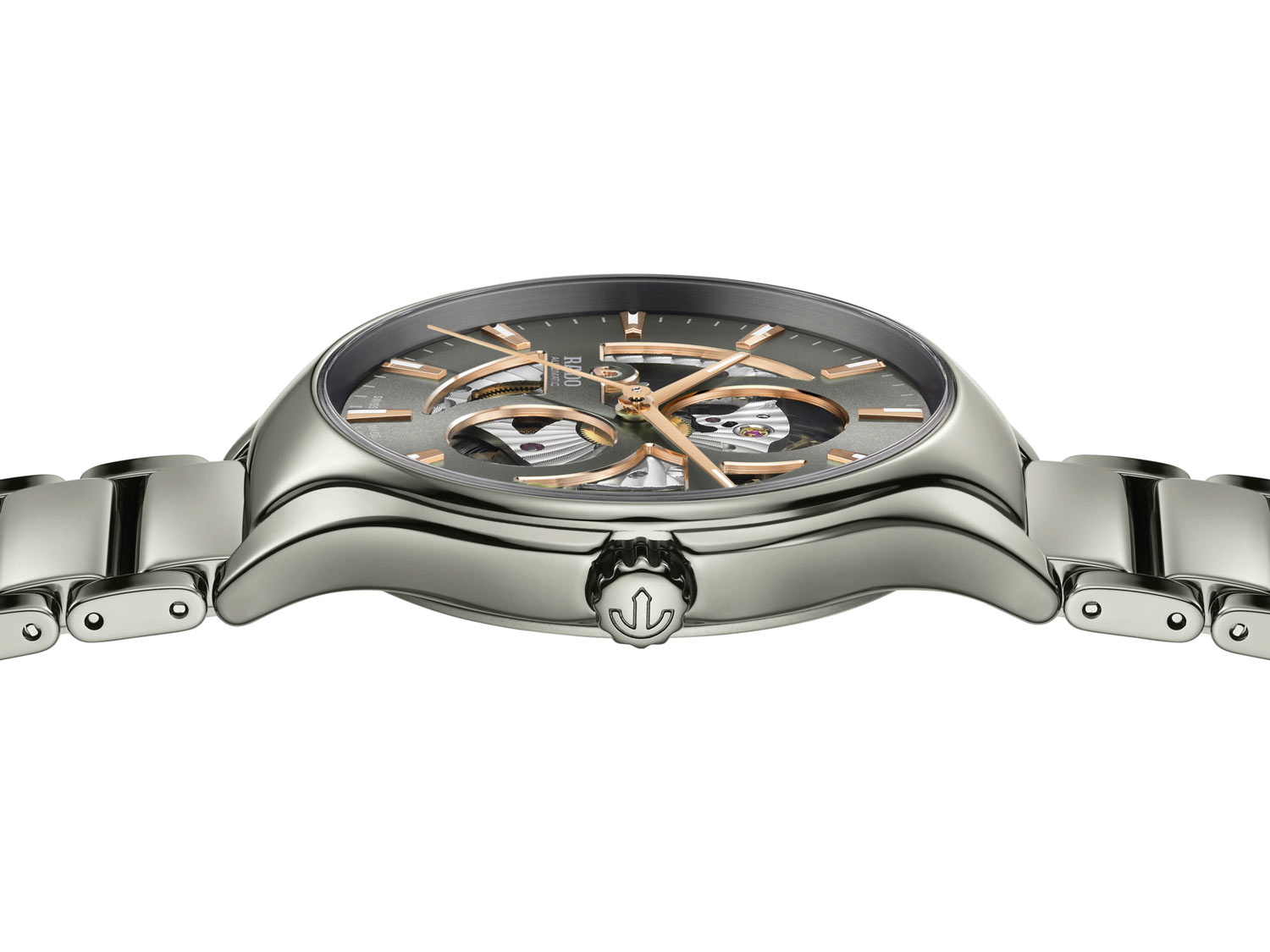 Přední strana skeletových hodinek Rado je chráněna safírovým sklem odolným proti poškrábání. Sklo kryje skeletový číselník, díky kterému můžete obdivovat mechanismus. Majitel tohoto švýcarského modelu může pozorovat složité pohyby automatického kalibru Rado R734, který nabízí rezervu chodu až 80 hodin. Tento unikátní strojek je vybaven speciální silikonovou pružinou Nivachron™, která ochrání systém před magnetizací a vyššími teplotami. Prezentované náramkové hodinky Rado se pyšní rafinovanými detaily. Kontrast šedého slunečního ciferníku a zkoseného okraje v růžovém zlatě, stejně jako indexy pokryté bílou vrstvou Super-LumiNova®, vytváří harmonickou kompozici elegance a funkčnosti.