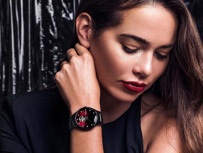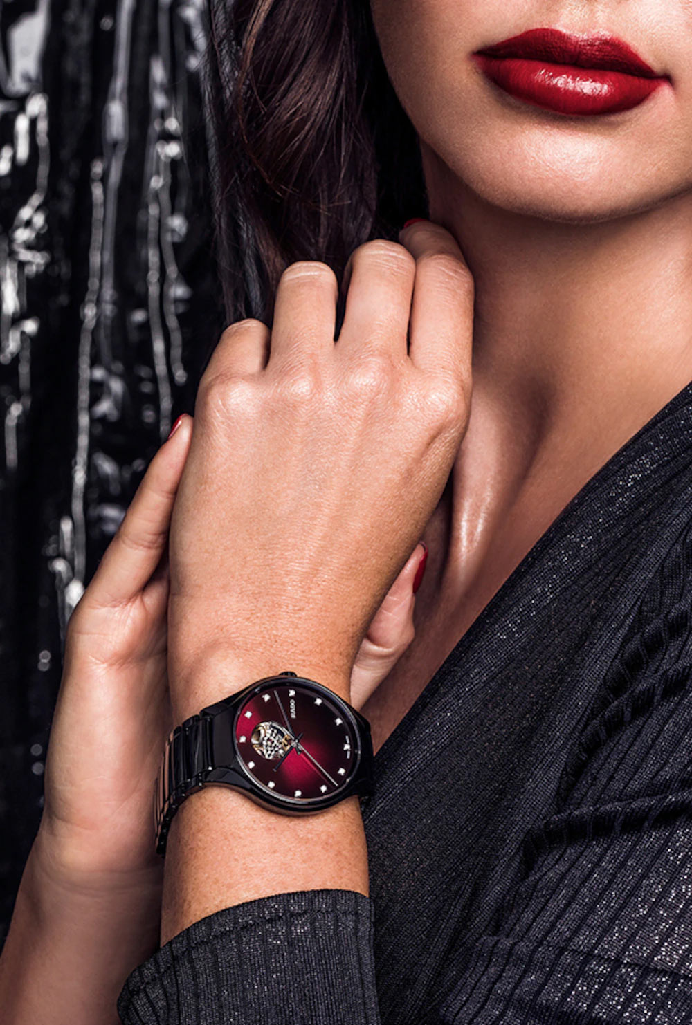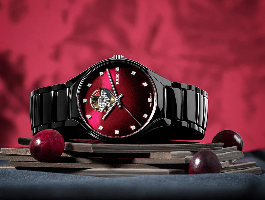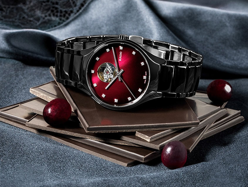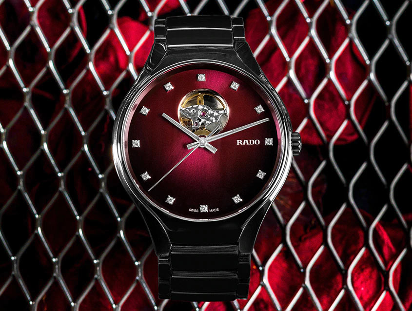 Rado True Heart zaujme svým nadčasovým designem tmavě červeného ciferníku s přechodovou úpravou. Červená je výrazná barva, která vyvolává četné asociace, většinou pozitivní. Červená symbolizuje lásku, energii, vášeň, odvahu a vitalitu. I když tato barva může převažovat nad ostatními, je určitě univerzální a lze ji kombinovat s různými styly a odstíny. Toto luxusní složení vám umožní na první pohled si hodinky zamilovat, což později potvrdí i hmatový vjem. Otvorem otevřeného srdce hodinky odhalují své tajemství – odhalují vlásenku, která je vibrujícím srdcem Machineku. Kolem ciferníku je osazeno 12 špičkových křišťálových diamantů Top Wesselton, které slouží nejen jako ušlechtilá dekorace, ale také jako časové měřítko. Navzdory lákavé pozvánce z ciferníku nesmí chybět pouzdro kolem. Příjemná na dotek a černá záře high-tech keramiky získané vlastním postupem Rado dodá eleganci každému večernímu outfitu. Inovativní materiál kromě vzhledu zaručuje dlouhodobou odolnost, lehkost a pohodlí s kvalitou, kterou lze zažít pouze u keramických hodinek RADO.
