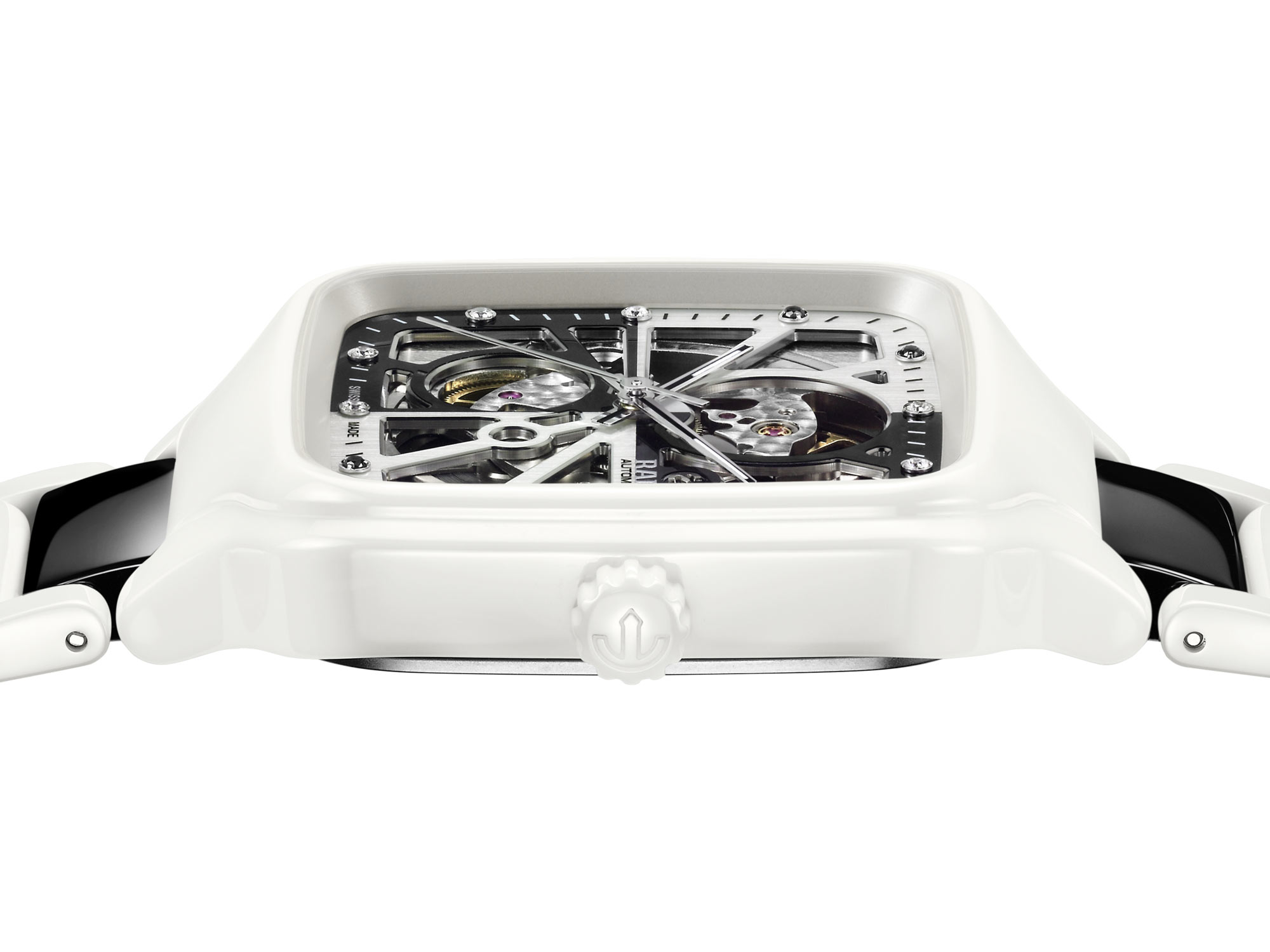 Hodinky značky Rado se vyznačují elegantním monoblokovým pouzdrem, které bylo navrženo v nadčasové a univerzální velikosti 38 mm, jež se dokonale hodí na jakékoli zápěstí. Pocit luxusu umocňuje korunka z high-tech keramiky v jemné, čistě bílé barvě, která zdůrazňuje moderní design. Také náramek, složený ze segmentů z bílé a černé keramiky, vytváří efektní kontrast, který dodává sofistikovanost každému outfitu. Je vybaven pevným, ale lehkým titanovým zapínáním. Přední strana je vyrobena z vysoce odolného safírového skla s antireflexní úpravou na obou stranách. Ve středu zadního krytu se nachází jedinečný gravírovaný nápis „LIMITED EDITION ONE OF 888“, který podtrhuje exkluzivitu tohoto modelu.