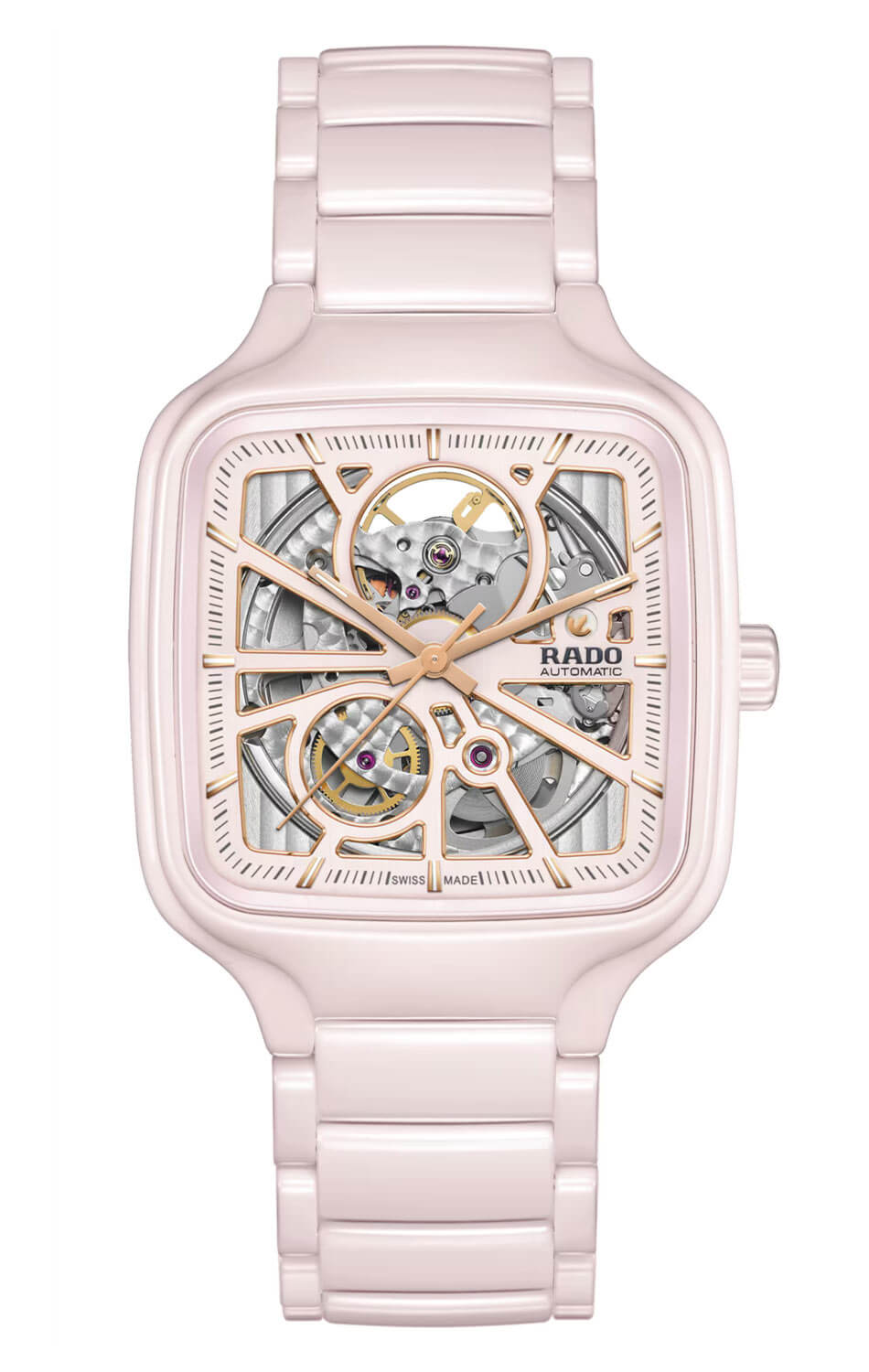 Monolitické pouzdro o průměru 38 mm a plynule navazující náramek byly vyrobeny z leštěné high-tech keramiky v pudrově růžovém odstínu – materiálu, který je lehký, hypoalergenní a mimořádně odolný proti poškrábání. Keramika zajišťuje nejen pohodlné nošení, ale i nadčasový vzhled, který neztrácí lesk. Náramek Rado je zakončen titanovou motýlkovou sponou, která spojuje eleganci s praktičností. Také zadní víčko je z titanu, což snižuje celkovou hmotnost a podtrhuje důraz na detail. Volba těchto materiálů není jen estetickým rozhodnutím, ale jasným vyjádřením kvality a luxusu v nejčistší podobě.