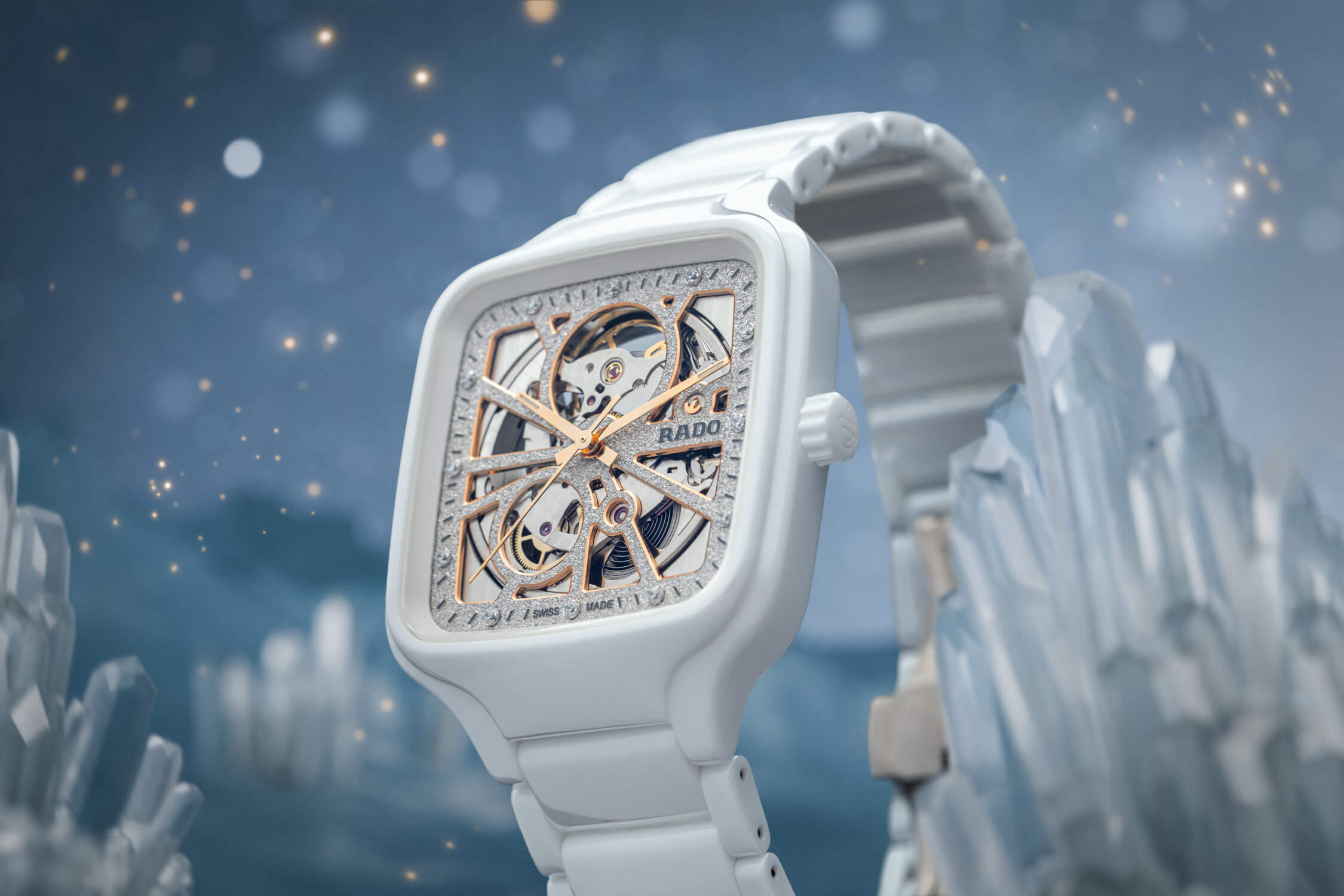 To, co přitahuje pohled, je jemné bohatství zpracování. Pouzdro a náramek z leštěné bílé keramiky tvoří dokonalé pozadí pro ciferník připomínající zmrzlý krystal. Jeho povrch zdobí dekorace se strukturou diamantového prachu v rhodiovaném odstínu, na níž je rozmístěno dvanáct diamantů Top Wesselton VS–SI o celkové hmotnosti 0,096 ct – každý zasazený do růžově zlatého rámečku a třpytící se jako sníh v ranním slunci. Charakteristický pro Rado je pohyblivý symbol kotvy, vyvedený v růžovém zlatě, který se otáčí na pozadí stříbrné destičky a podtrhuje jubilejní charakter časoměřiče. Celek spojuje harmonický rytmus – geometrický, plný světla a lehkosti.
