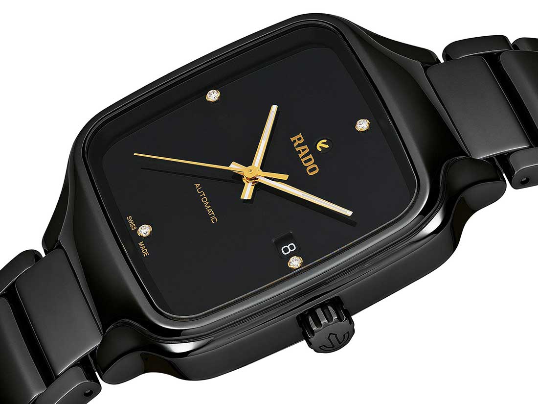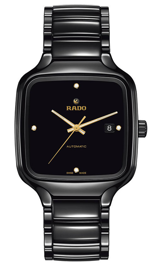 Rado True Square Automatic Diamonds s rozměry 38,0 x 44,2 x 9,6 (šířka x délka x výška v mm) jsou ideální pro ty, kteří hledají větší hodinky a pro ty, kteří chtějí od hodinek extra hodnotu, jako je sada 4 0,040 karátových diamantů Top Wesselton. na místech indexu. Použitá černá keramika dodává Rado True nebývalou hloubku barev, hřejivost a pocit luxusu. Srdcem hodinek je automatický Machineek ETA C07.611 s rezervou chodu 80 hodin.