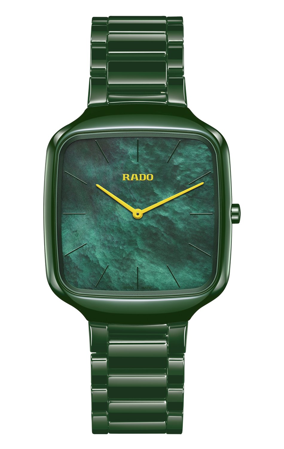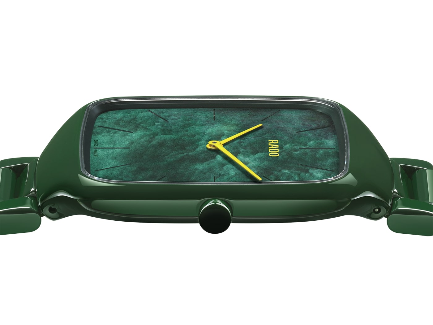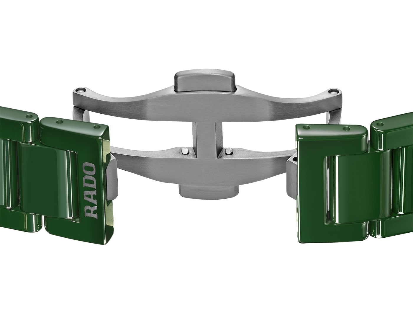 Jednodílná monobloková konstrukce a ploché safírové sklíčko s antireflexní vrstvou zdůrazňují odolnost a eleganci hodinek, zajišťují pohodlné nošení a dlouhou životnost. Zelený, opalizující perleťový číselník odvážně kontrastuje se žlutými lakovanými ručičkami a ladícím logem Rado, což vytváří jedinečnou kompozici. Leštěný náramek z high-tech keramiky dokonale doplňuje jednotný, moderní vzhled hodinek. Voděodolnost do přibližně 30 metrů (3 bary) činí z těchto keramických hodinek ideálního společníka pro každou situaci, i nečekaný déšť.