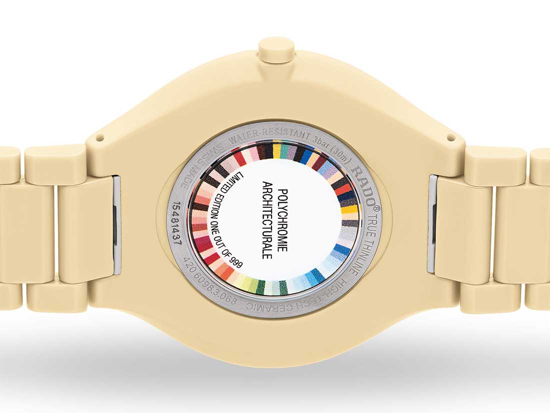 K vytvoření hodinek v devíti vybraných barvách z palety „Architectural Polychromy“ využil Rado všechny znalosti a zkušenosti získané za 30 let práce s keramikou. Jako Master of Materials věděli, že získat správné odstíny bude nesmírně obtížné. Barevné palety "Architectural Polychromy" z let 1931 a 1959 předběhly svou dobu. Jedná se o 63 barev s architektonickým významem, které pomáhají vytvářet prostor a hloubku a zároveň mají hluboký fyziologický a psychologický význam. Barvy jsou rozděleny do devíti skupin s různými odstíny a tóny. Palety jsou dodnes široce používány architekty a designéry po celém světě, což dokazuje jejich trvalou přitažlivost a nadčasovost, stejně jako jedinečný status Le Corbusiera jako skutečného vizionáře.