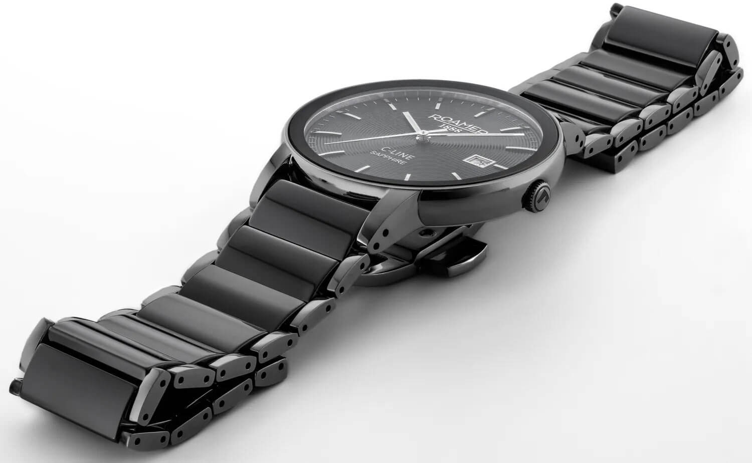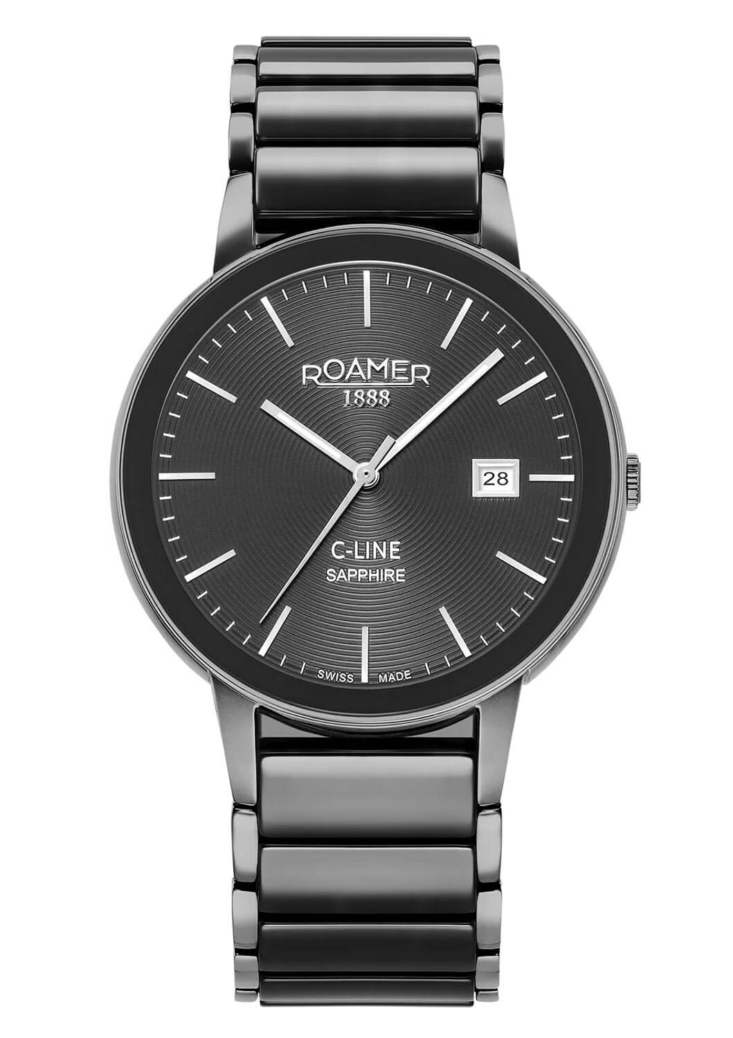 Model je vybaven švýcarským quartzovým strojkem, který spojuje přesnost s každodenní spolehlivostí. Pouzdro o průměru 41 mm je vyrobeno z ušlechtilé oceli s černým kroužkem potaženým povlakem IP, odolným vůči oděru a změnám barvy. Náramek využívá centrální články z high-tech keramiky – materiálu ceněného pro svou odolnost proti poškrábání a pohodlí při nošení. Na ciferníku s gilošovaným vzorem se nacházejí štíhlé liniové indexy, datumovka na třetí hodině a logo Roamer 1888. Celek chrání safírové sklíčko odolné proti poškrábání, které zvyšuje životnost i čitelnost hodinek.