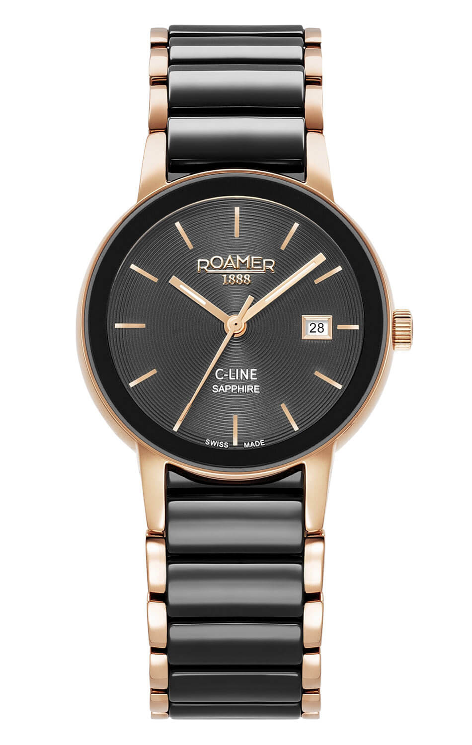 Dámské hodinky Roamer C-Line 997844 46 85 20 jsou modelem, který dokonale odpovídá očekáváním žen, jež si cení čistoty tvaru a moderního luxusu. Kombinace růžově zlatého pouzdra s černou high-tech keramikou vytváří harmonii – jemnou, ale zcela zřetelnou. Ideální pro kancelářské outfity i večerní příležitosti, kde záleží na detailu a decentní přítomnosti šperku. Tento časoměřič neovládne stylizaci, nýbrž ji s grácií doplní jako promyšlený akcent, který nepotřebuje žádný další komentář. Minimalistická estetika? Ano, ale s precizně vyváženým poměrem mezi materiálem a funkcí.