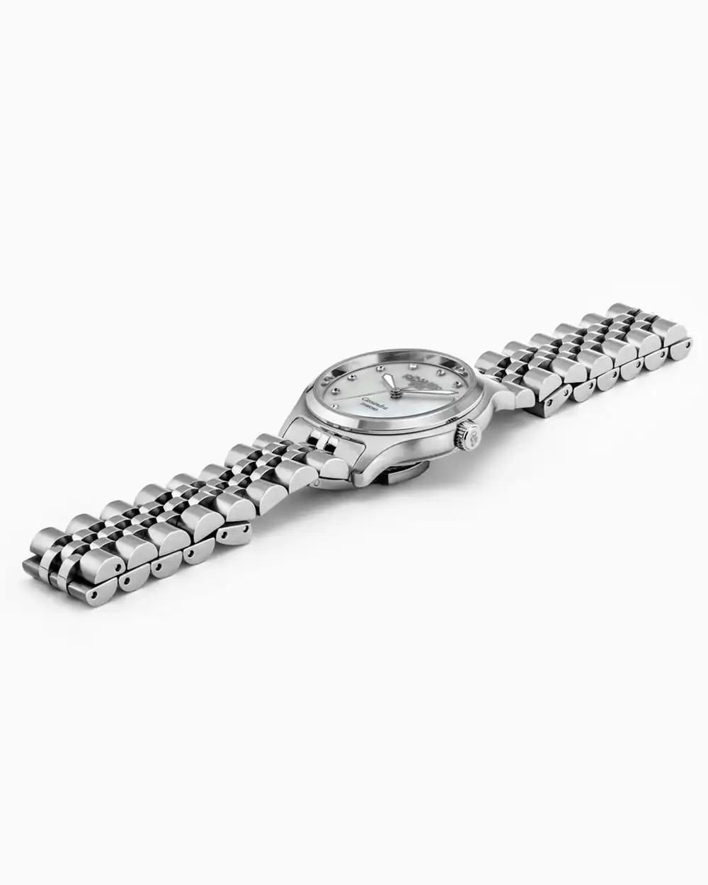 Pouzdro o průměru 31 mm je vyrobeno z vysoce kvalitní ušlechtilé oceli a jeho vyvážený tvar se dokonale usazuje na ženském zápěstí. Ciferník s jedinečným designem se třpytí přirozenými odlesky a dvanáct pravých diamantů plní funkci hodinových indexů, čímž dodávají celku lesk a eleganci. Hodinky chrání safírové sklíčko odolné proti poškrábání a celek je doplněn klasickým náramkem z jemných článků, zakončeným pohodlnou motýlkovou sponou. O přesnost se stará švýcarský quartzový strojek, který zajišťuje, aby byl každý okamžik měřen s diskrétní přesností.