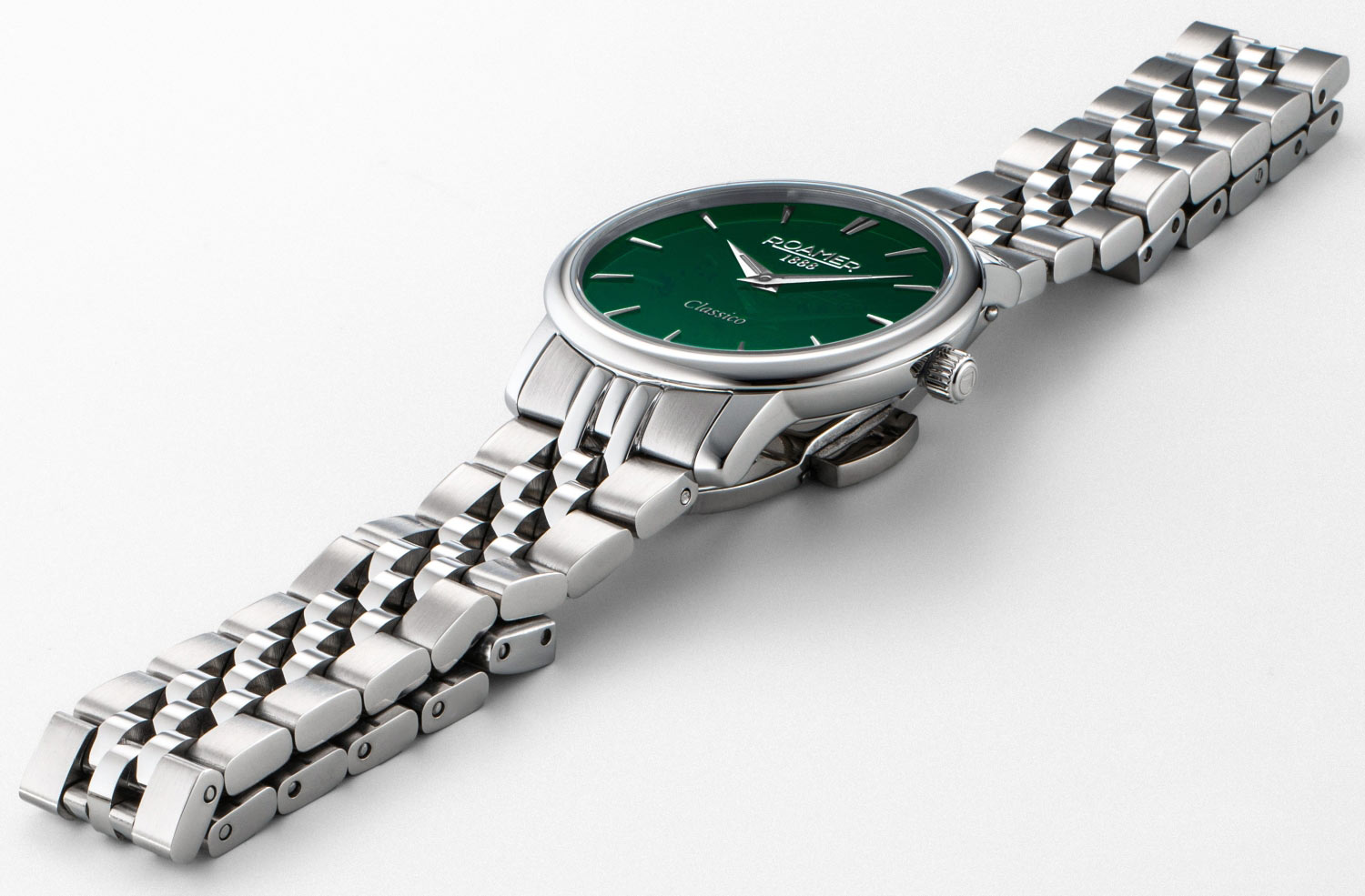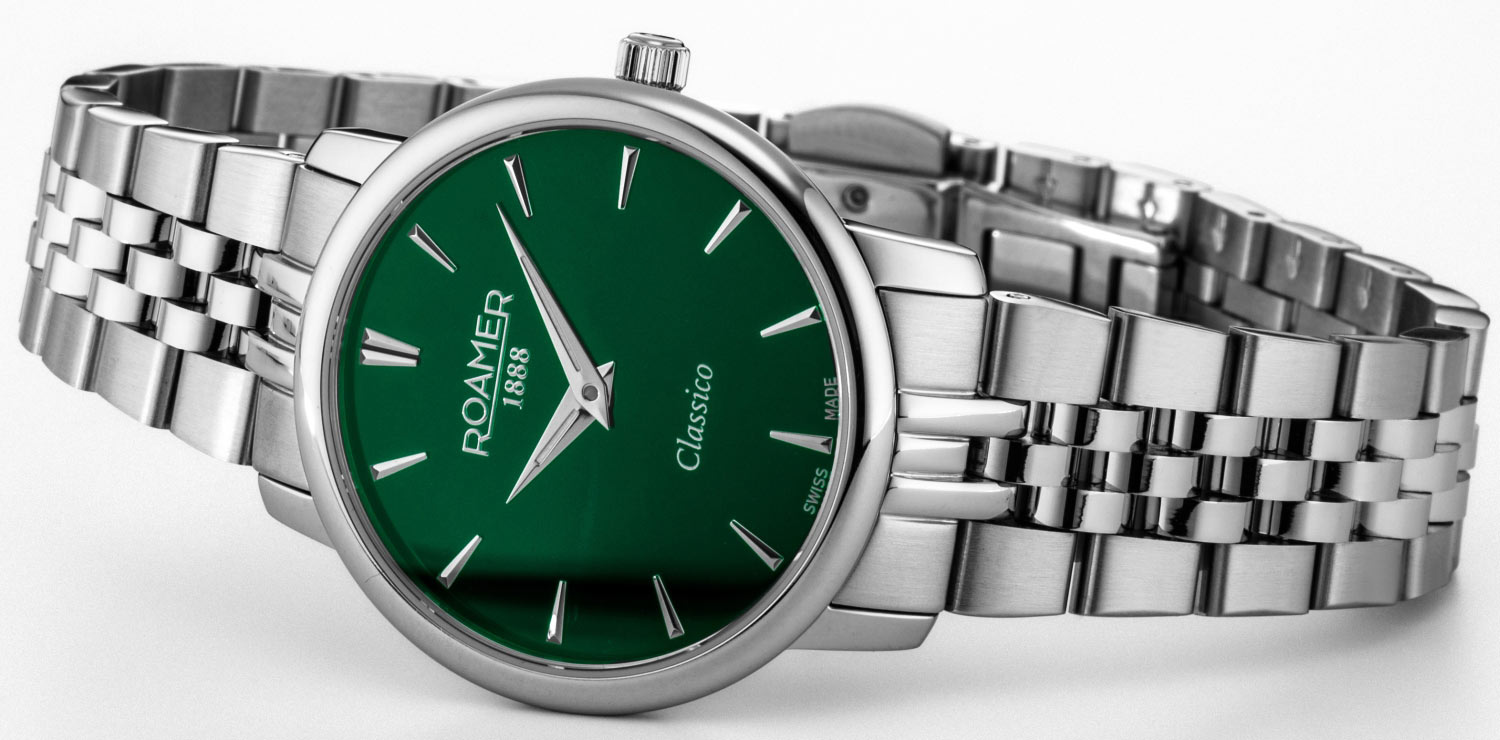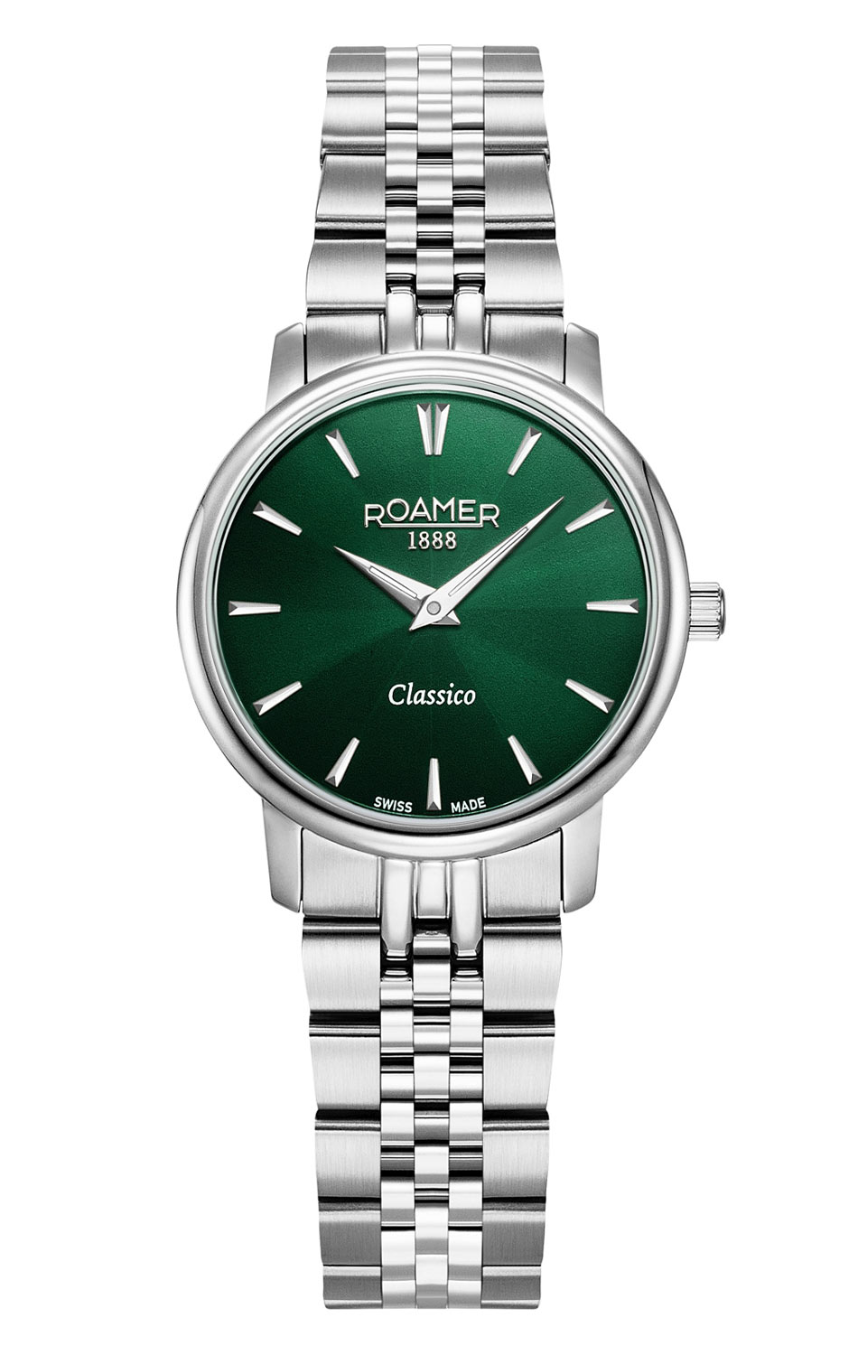 Dámské hodinky Roamer Classico Ladies 971857 41 75 50 – elegance, která nepotřebuje okázalost. Tyto hodinky vznikly s myšlenkou na ženy, které svou sílu vyjadřují jemností. Štíhlá forma, zelený ciferník a jeho indexy připomínají ducha tradičního hodinářství, ale v podobě přizpůsobené tempu moderního života – uspořádaného, vědomého a krásného v jednoduchosti. Pouzdro o dámském průměru 30 mm je doplněno ocelovým náramkem, který zajistí pohodlné a bezpečné nošení.