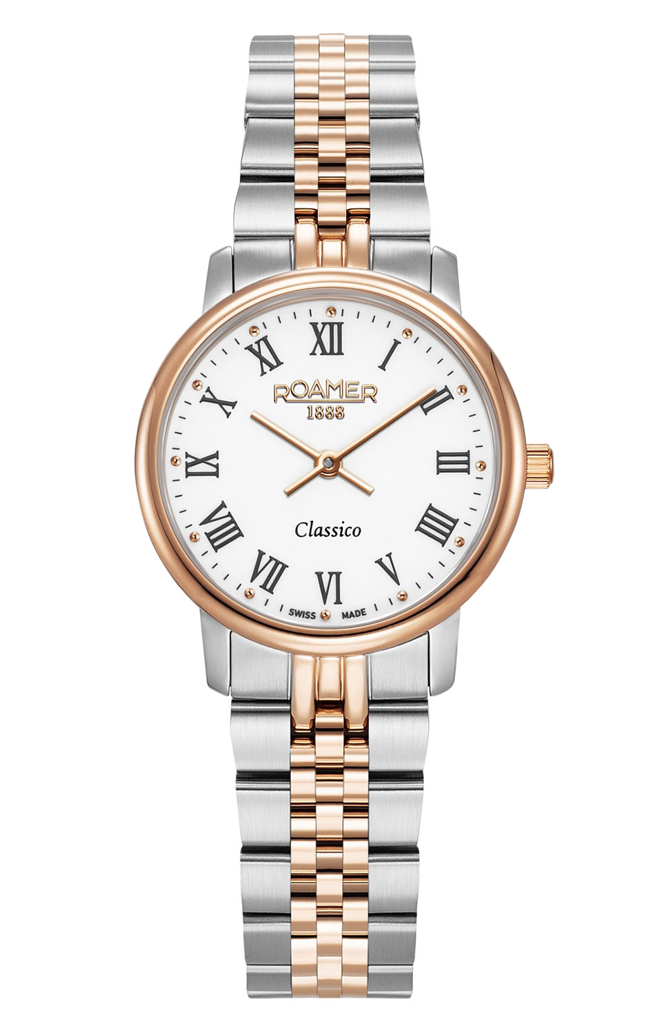 Dvoubarevné dámské hodinky Roamer Classico Ladies 971857 49 25 50 – elegance, která nepotřebuje okázalost. Tyto hodinky vznikly pro ženy, které svou sílu vyjadřují jemností. Štíhlá forma, šampaňský kontrast a tenké indexy připomínají ducha tradičního hodinářství, ale v provedení přizpůsobeném tempu moderního života – uspořádaného, vědomého a krásného v jednoduchosti. Pouzdro o dámském průměru 30 mm s růžově zlatou povrchovou úpravou IP na lunetě je doplněno ocelovým náramkem bicolor, který zaručuje pohodlné a bezpečné nošení.