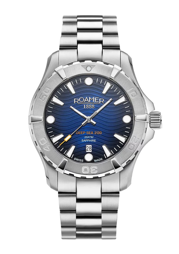 Pánské hodinky Roamer 860833 41 45 70 na náramku jsou nabízeny s modrým ciferníkem umístěným ve stříbrné ocelové konstrukci. Spojnicí stylově propojující ji se zbytkem je oranžový akcent znatelný na špičce vteřinové ručky a na nápisu s názvem kolekce. Součástí tohoto odkazu je i trojrozměrný, zvlněný vzor, který zakončuje celý povrch ciferníku. Tento gilošovaný vzor odkazuje na mořský styl diverské kolekce Deep Sea 200. Na vysokou vnímanou hodnotu má nepochybně vliv nejen zvučná solidnost, ale také použité logo Roamer s datem vytvoření, použité indexy, švýcarská značka kvality a koruna podepsaná iniciálou značky.