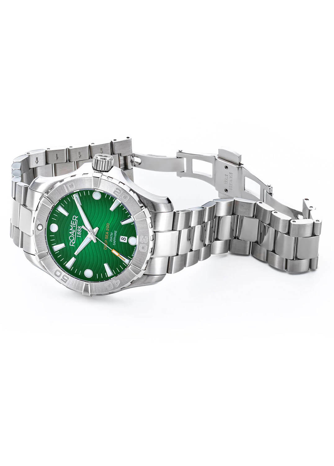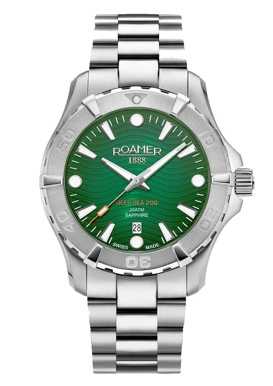 Pánské hodinky na náramku Roamer 860833417571 jsou nabízeny se zeleným číselníkem v dvoubarevném provedení pouzdra z oceli. Stylový prvek, který je sjednocuje s celkovým designem, představuje oranžový detail na konci sekundové ručičky a nápis s názvem kolekce. Dalším prvkem je trojrozměrný vlnkový vzor, který pokrývá celou plochu číselníku. Tento gilošovaný vzor odkazuje na námořní styl kolekce potápěčských hodinek Deep Sea 200. Vysokou hodnotu hodinek podtrhují nejen jejich robustnost, ale také aplikované logo značky Roamer spolu s rokem založení, aplikované indexy, švýcarská značka kvality a korunka zdobená iniciálem značky.