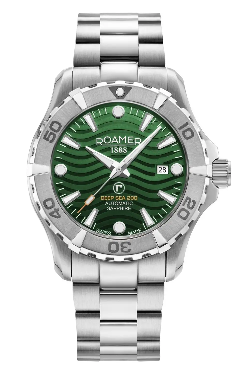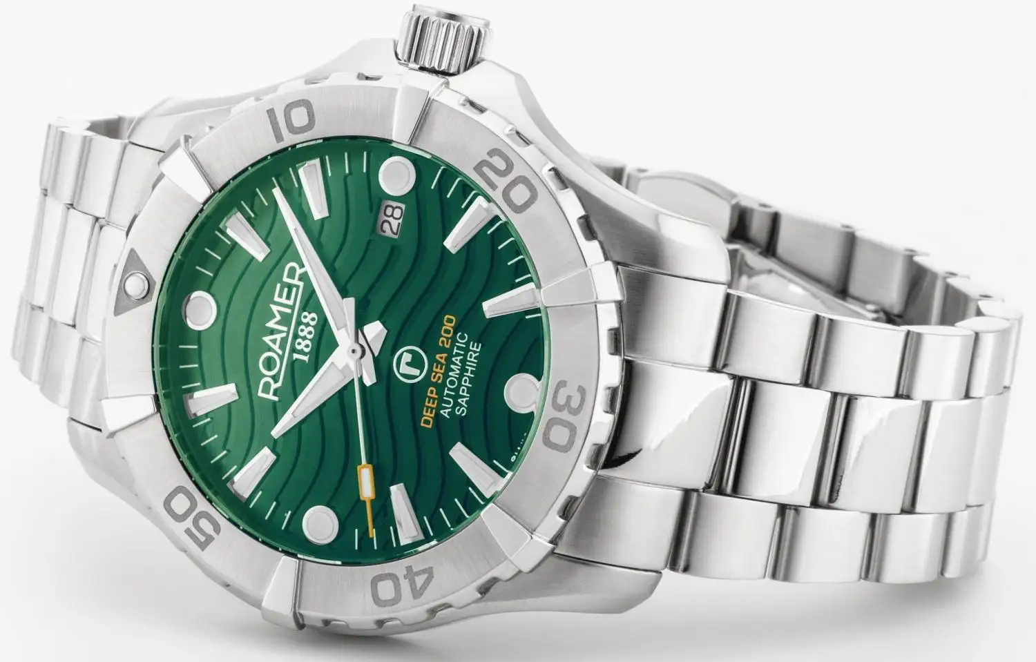 Pánské potápěčské hodinky Roamer Deep Sea 200 Automatic 860983 41 55 70 jsou modelem, který spojuje funkčnost nástrojových hodinek s moderní, stylovou formou. Integrovaný náramek, masivní pouzdro a zelený číselník s reliéfním vlnovým vzorem vytvářejí design, který nejen přitahuje pozornost, ale také vzbuzuje důvěru. Safírové sklo chrání číselník proti poškrábání a náramek z plných článků je zakončen bezpečnou motýlkovou sponou.