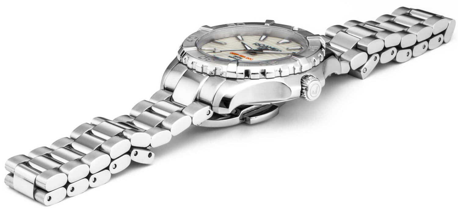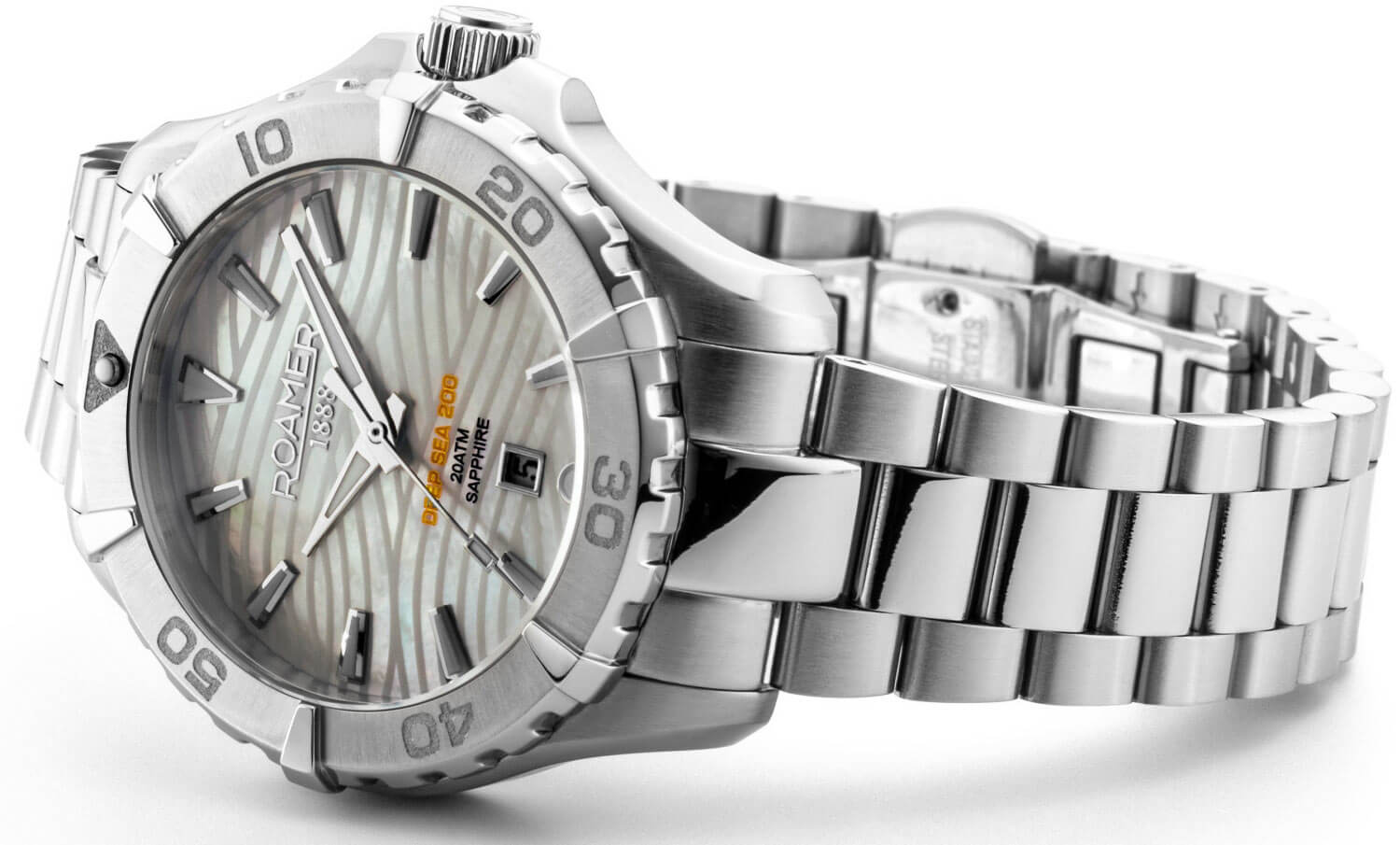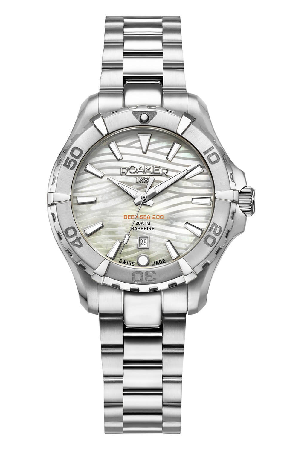 Roamer Deep Sea 200 Lady má ocelové pouzdro s vodotěsností do 200 metrů. Model doplňuje otočná luneta s minutovou stupnicí pro měření času ponoření, šroubovací víko a korunka. Přední stranu chrání vysoce odolné safírové sklíčko, které účinně chrání perleťový ciferník před poškozením. Výrazným prvkem ciferníku je nádherný motiv mořských vln, které se lesknou v závislosti na dopadajícím světle. Hodinky jsou zavěšeny na ocelovém náramku, který se pohodlně přizpůsobí zápěstí. O chod se stará švýcarský strojek Ronda — osvědčený a spolehlivý mechanismus napájený baterií.