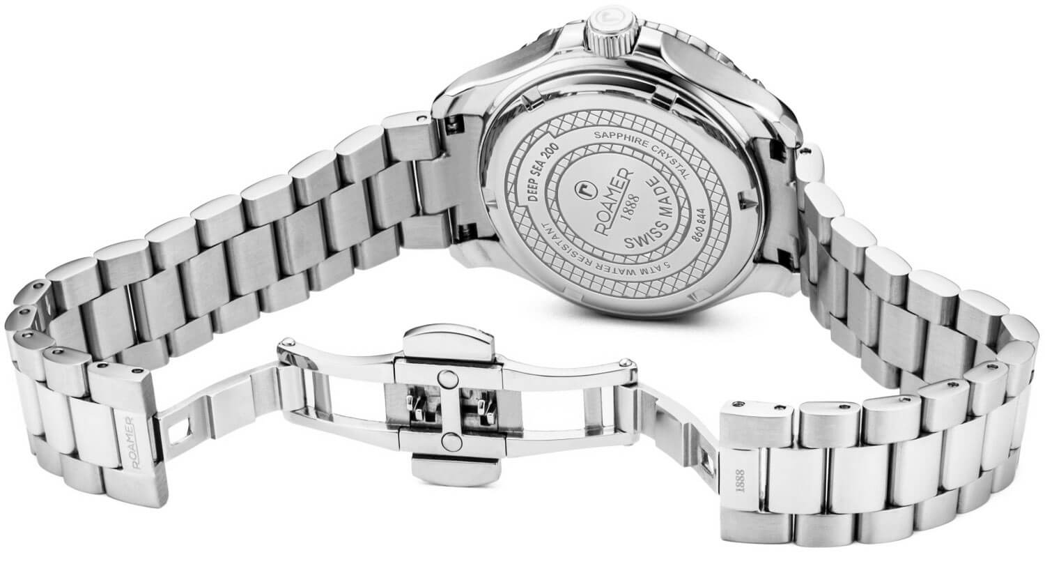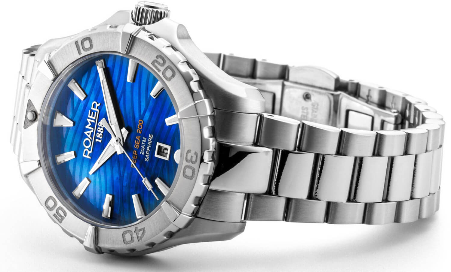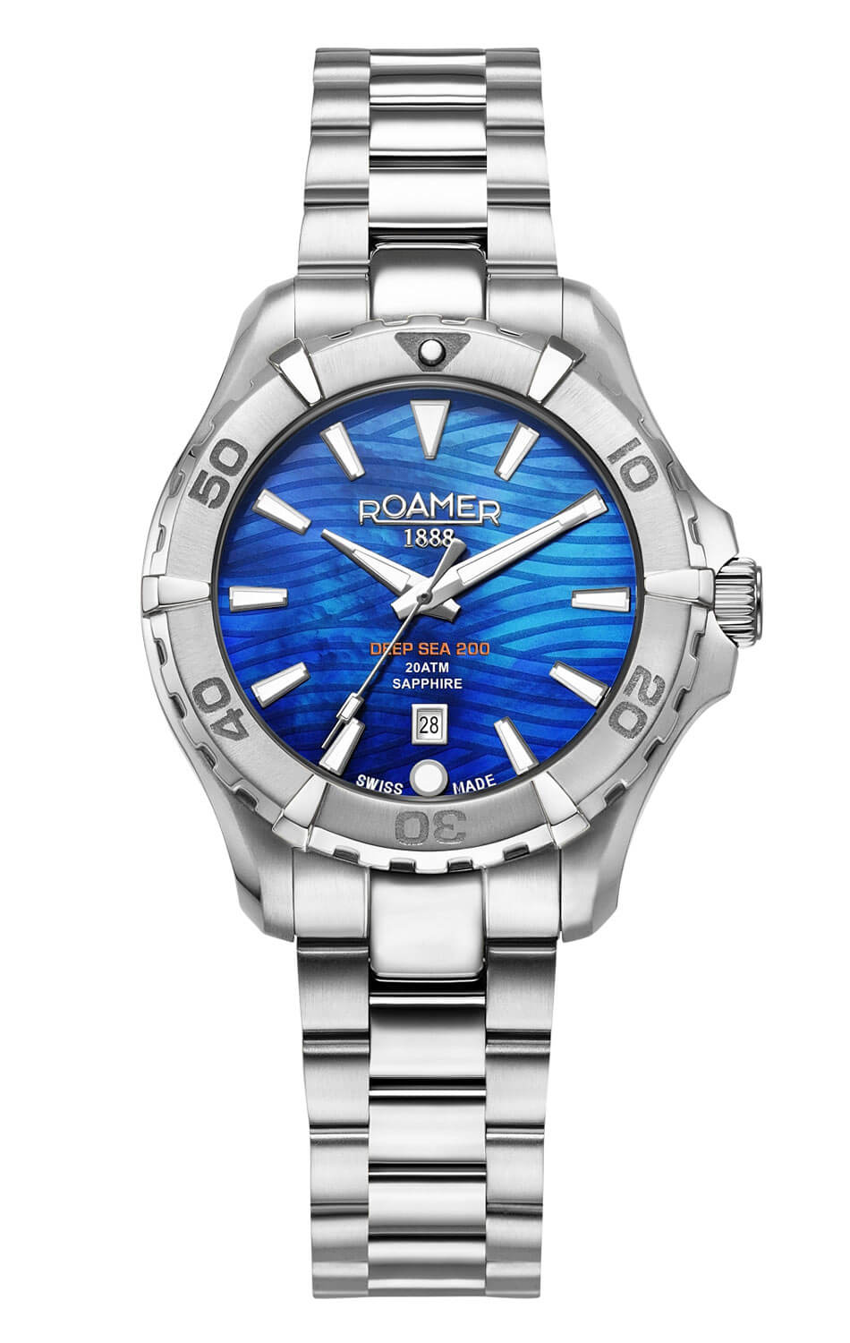 Roamer Deep Sea 200 Lady má ocelové pouzdro s vodotěsností do 200 metrů. Model doplňuje otočná luneta s minutovou stupnicí pro měření času ponoření, šroubovací víko a korunka. Přední stranu chrání vysoce odolné safírové sklíčko, které účinně chrání perleťový ciferník před poškozením. Výrazným prvkem ciferníku je nádherný motiv mořských vln, které se lesknou v závislosti na dopadajícím světle. Hodinky jsou zavěšeny na ocelovém náramku, který se pohodlně přizpůsobí zápěstí. O chod se stará švýcarský strojek Ronda — osvědčený a spolehlivý mechanismus napájený baterií.
