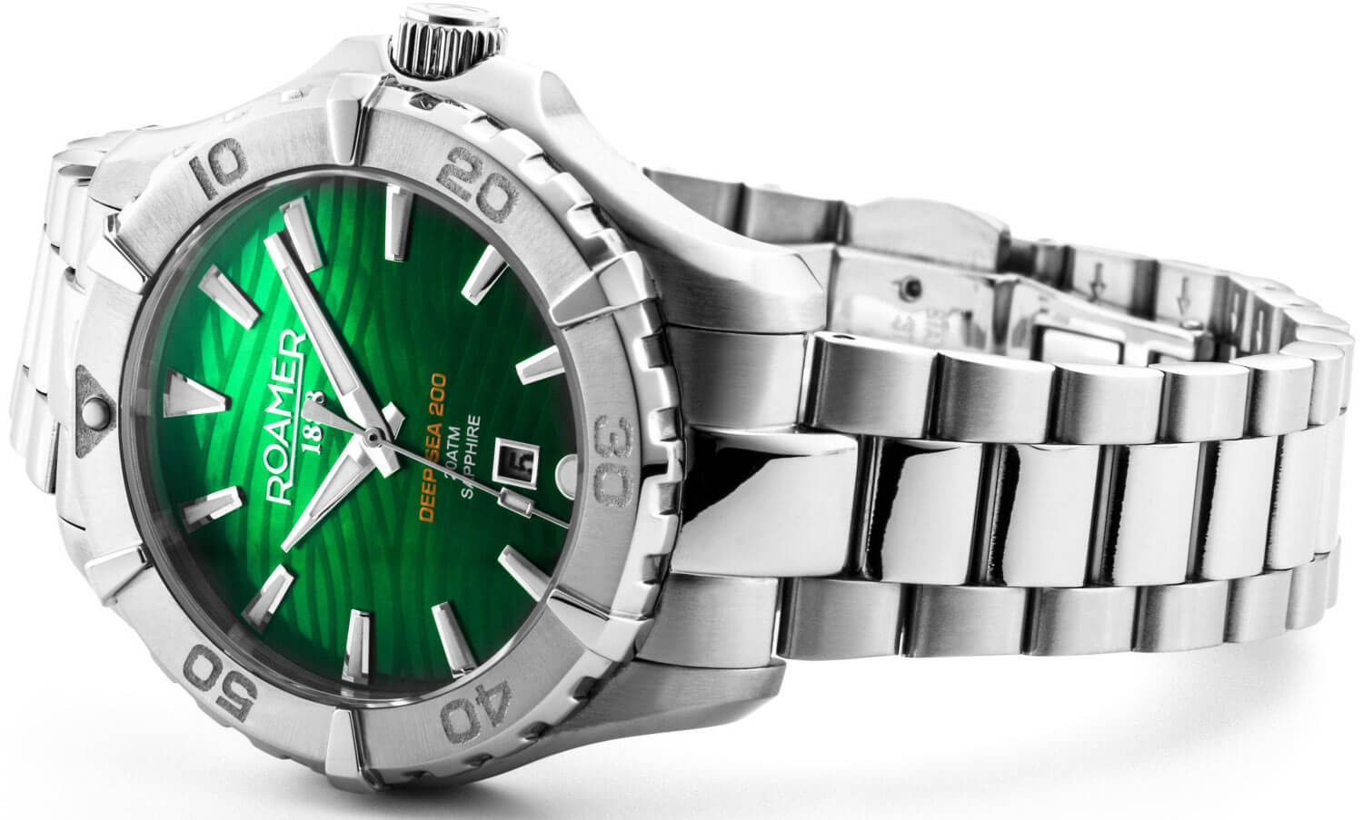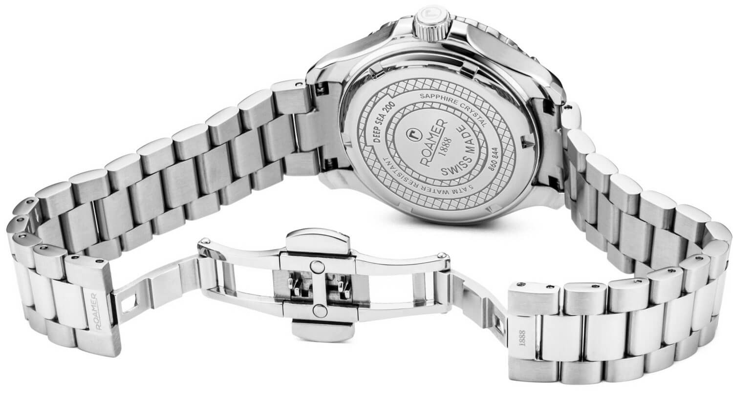 Roamer Deep Sea 200 Lady má ocelové pouzdro s vodotěsností do 200 metrů. Model doplňuje otočná luneta s minutovou stupnicí pro měření času ponoření, šroubovací víko a korunka. Přední stranu chrání vysoce odolné safírové sklíčko, které účinně chrání perleťový ciferník před poškozením. Výrazným prvkem ciferníku je nádherný motiv mořských vln, které se lesknou v závislosti na dopadajícím světle. Hodinky jsou zavěšeny na ocelovém náramku, který se pohodlně přizpůsobí zápěstí. O chod se stará švýcarský strojek Ronda — osvědčený a spolehlivý mechanismus napájený baterií.