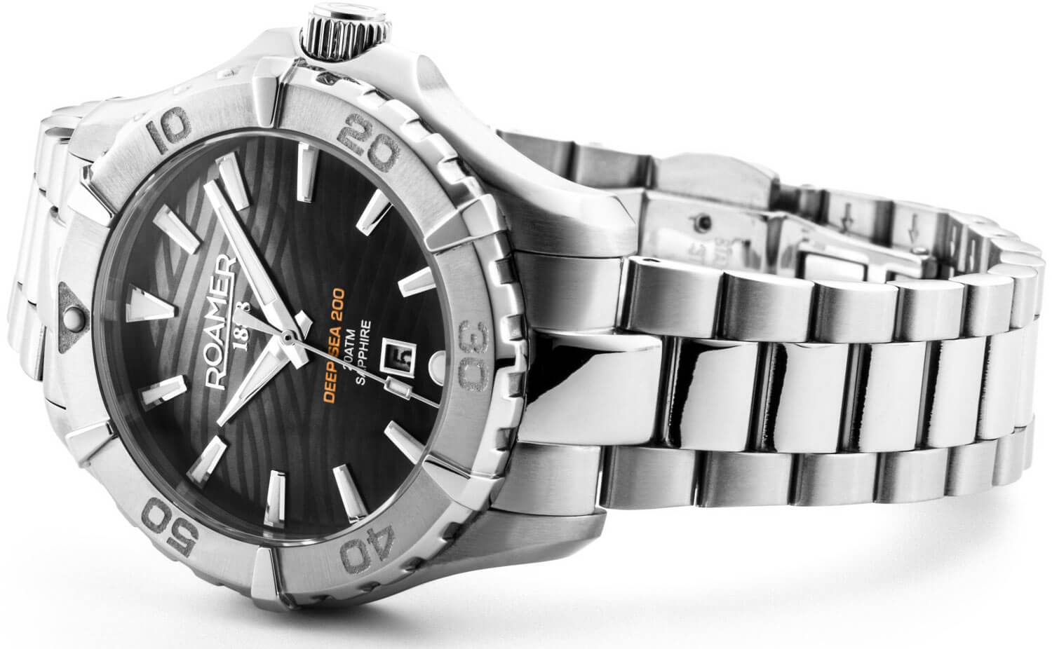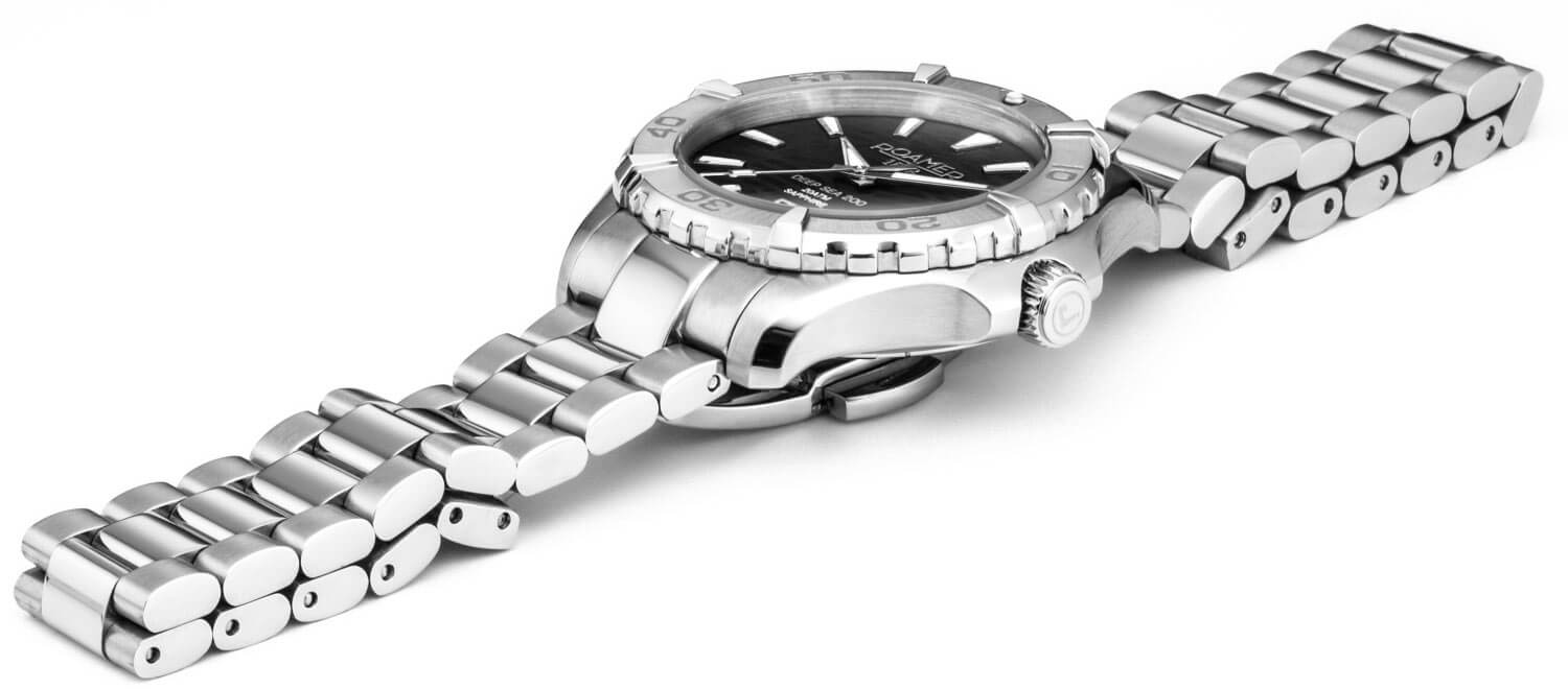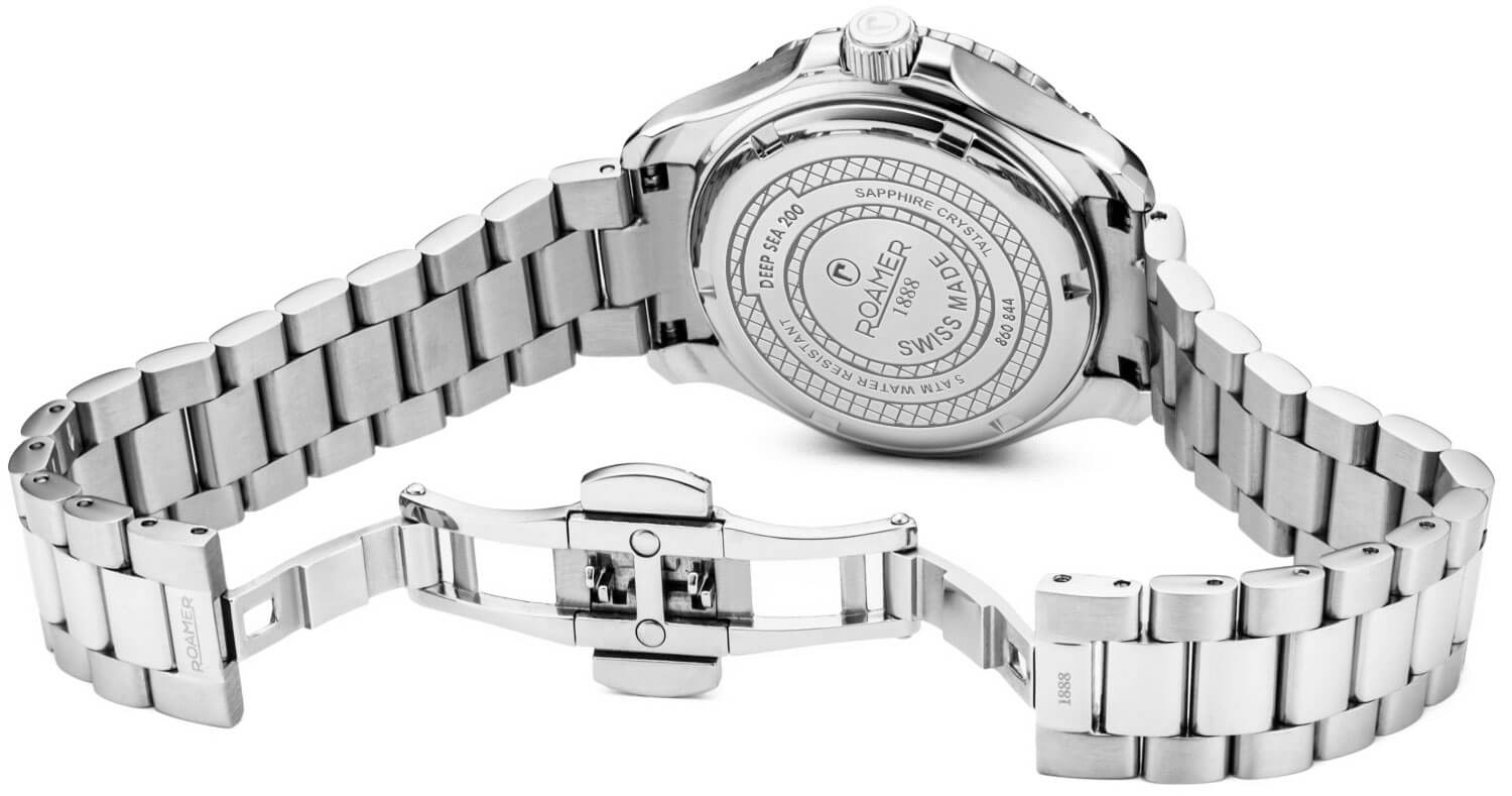 Roamer Deep Sea 200 Lady má ocelové pouzdro s vodotěsností do 200 metrů. Model doplňuje otočná luneta s minutovou stupnicí pro měření času ponoření, šroubovací víko a korunka. Přední stranu chrání vysoce odolné safírové sklíčko, které účinně chrání perleťový ciferník před poškozením. Výrazným prvkem ciferníku je nádherný motiv mořských vln, které se lesknou v závislosti na dopadajícím světle. Hodinky jsou zavěšeny na ocelovém náramku, který se pohodlně přizpůsobí zápěstí. O chod se stará švýcarský strojek Ronda — osvědčený a spolehlivý mechanismus napájený baterií.