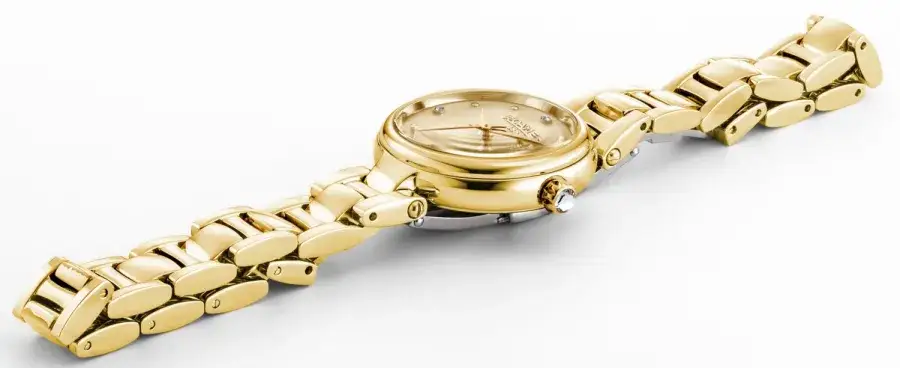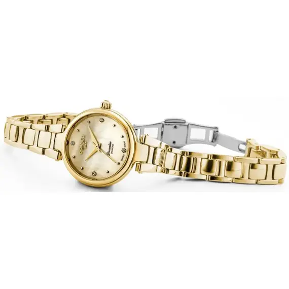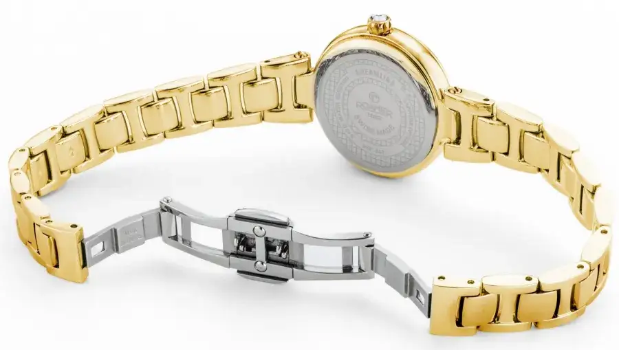 Pouzdro o průměru 28 mm bylo vyrobeno z vysoce kvalitní nerezové oceli pokryté zlatou vrstvou metodou, což zajišťuje stálost barvy a odolnost při každodenním používání. Perleťový číselník se třpytí přirozenými odlesky a byl ozdoben šesti pravými diamanty, které slouží jako indexy. Celek chrání safírové sklo – odolné proti poškrábání a dokonale čitelné. Uvnitř pracuje švýcarský quartzový strojek, který garantuje přesnost a spolehlivost každý den. Model doplňuje elegantní náramek zakončený motýlkovou sponou, díky níž se hodinky snadno a s potěšením nasazují – každý den.