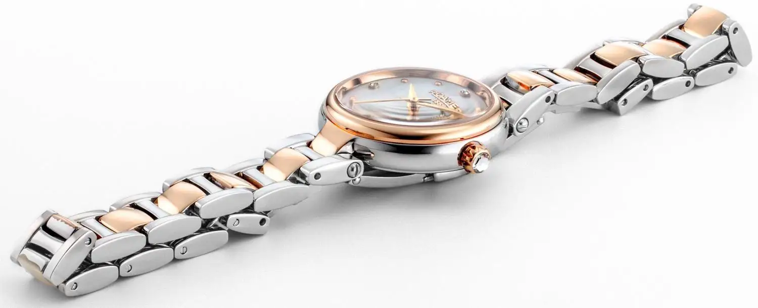 Pouzdro o průměru 28 mm je vyrobeno z vysoce kvalitní nerezové oceli a jeho bezel je pokryt růžovo-zlatou vrstvou, což zajišťuje stálost barvy i odolnost při každodenním používání. Perleťový číselník se třpytí přirozenými odlesky a je ozdoben šesti pravými diamanty, které slouží jako indexy. Celek chrání safírové sklo – odolné proti poškrábání a dokonale čitelné. Uvnitř pracuje švýcarský quartzový strojek, který garantuje přesnost a spolehlivost každý den. Model doplňuje elegantní náramek zakončený motýlkovou sponou, díky níž se hodinky snadno a s potěšením nasazují – každý den.