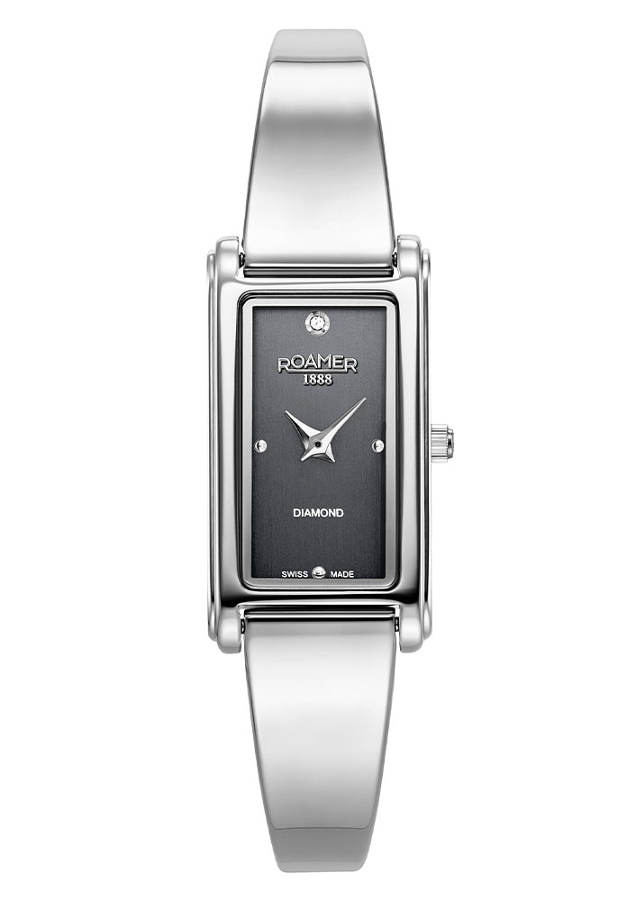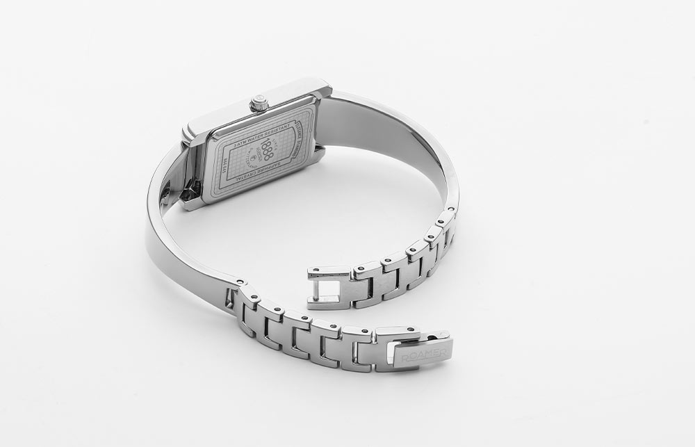 Dámské švýcarské hodinky Roamer Elegance Diamond se skládají z ocelového obdélníkového pouzdra o rozměrech 17 mm x 32 mm . Výrobce své hodinky zkombinoval s náramkem z bižuterní oceli ve stříbrné barvě se zapínáním na sponu. Na zadní straně hodinek je víko, které uzavírá celou konstrukci a chrání quartzový strojek. Prezentované dámské hodinky Roamer jsou vybaveny bateriovým strojkem Ronda Swiss Made . Zaručuje velmi dobrou časomíru.