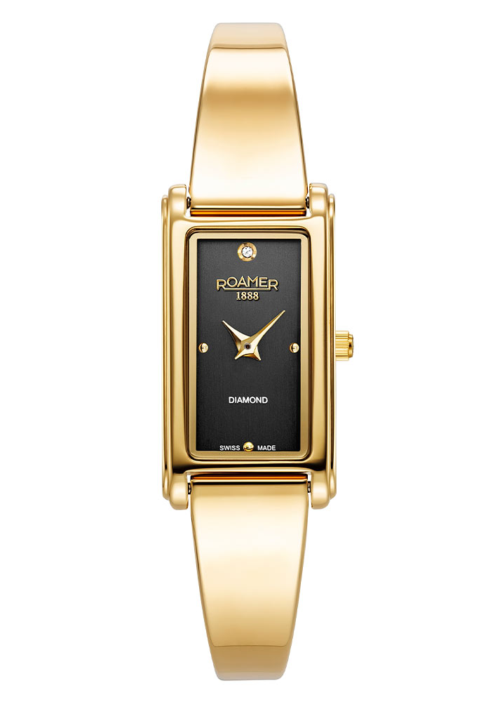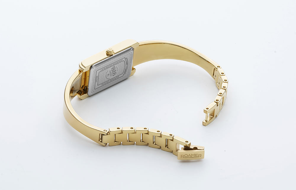 Dámské švýcarské hodinky Roamer Elegance Diamond mají obdélníkové ocelové pouzdro o rozměrech 17 mm x 32 mm se zlatým IP zlacením. Výrobce své hodinky zkombinoval s náramkem z bižuterní oceli ve zlaté barvě se zapínáním na sponu. Na zadní straně hodinek je víko, které uzavírá celou konstrukci a chrání quartzový strojek. Prezentované dámské hodinky Roamer jsou vybaveny bateriovým strojkem Ronda Swiss Made. Zaručuje velmi dobrou časomíru.