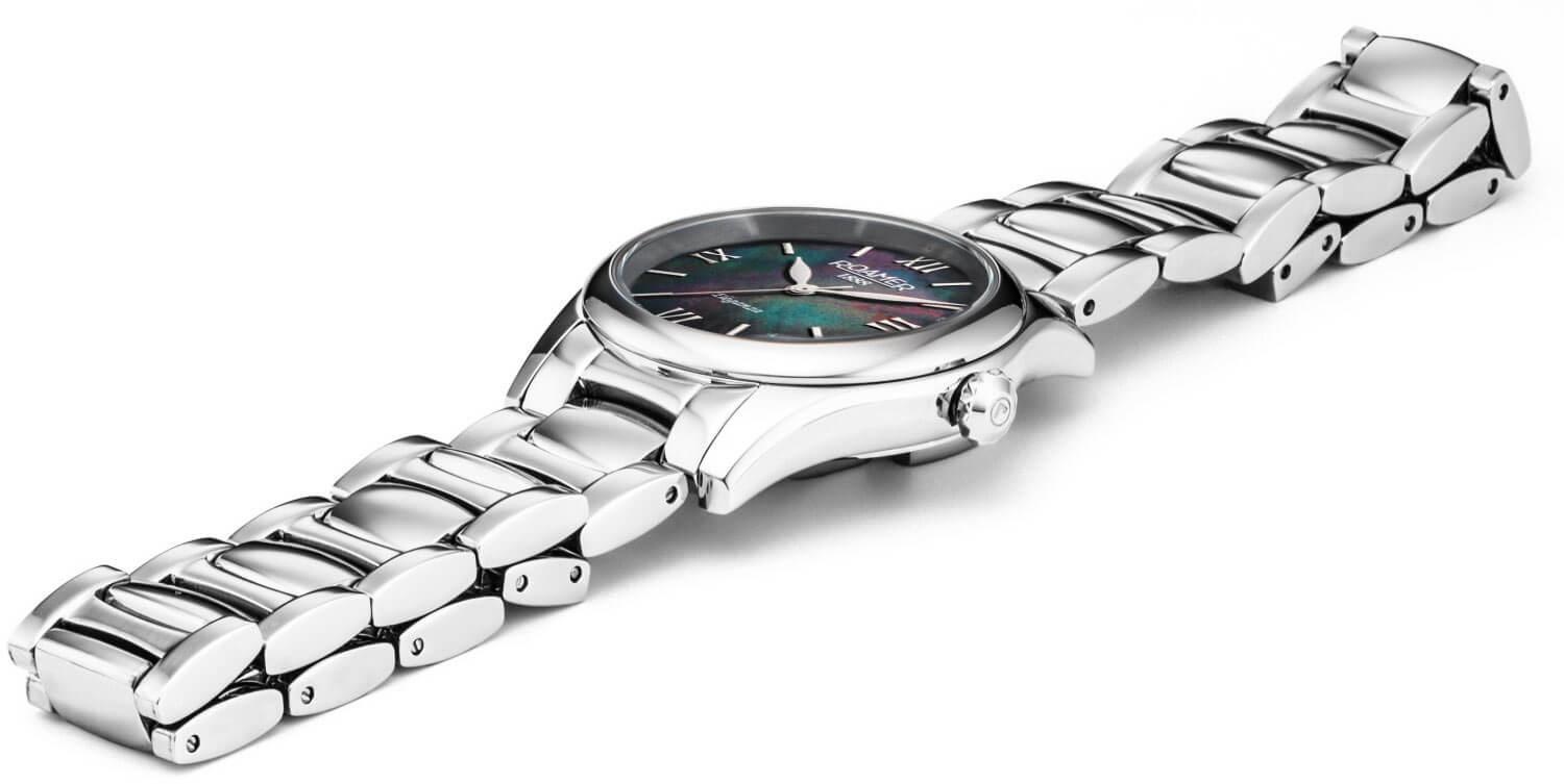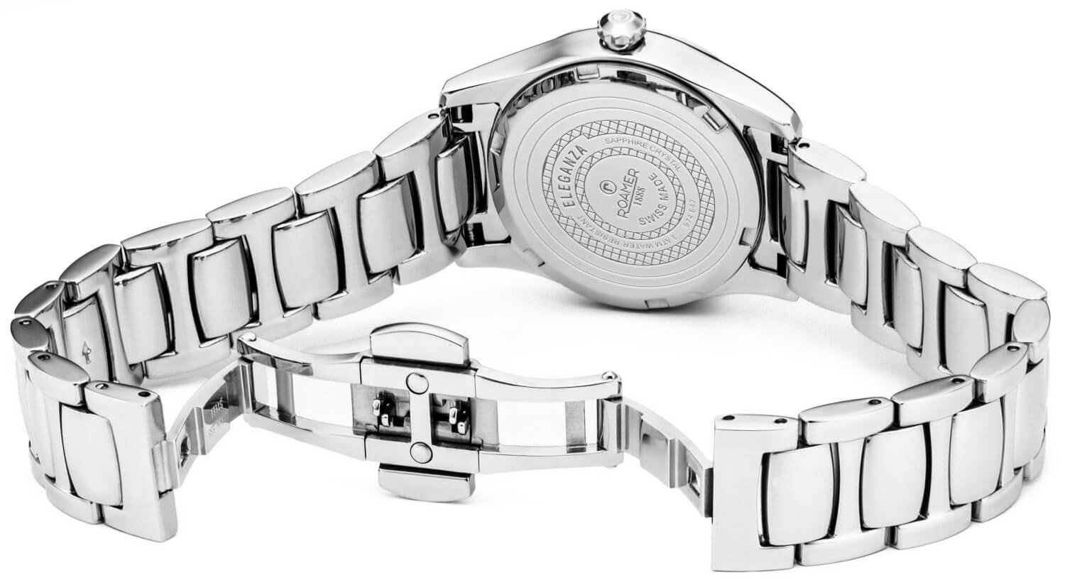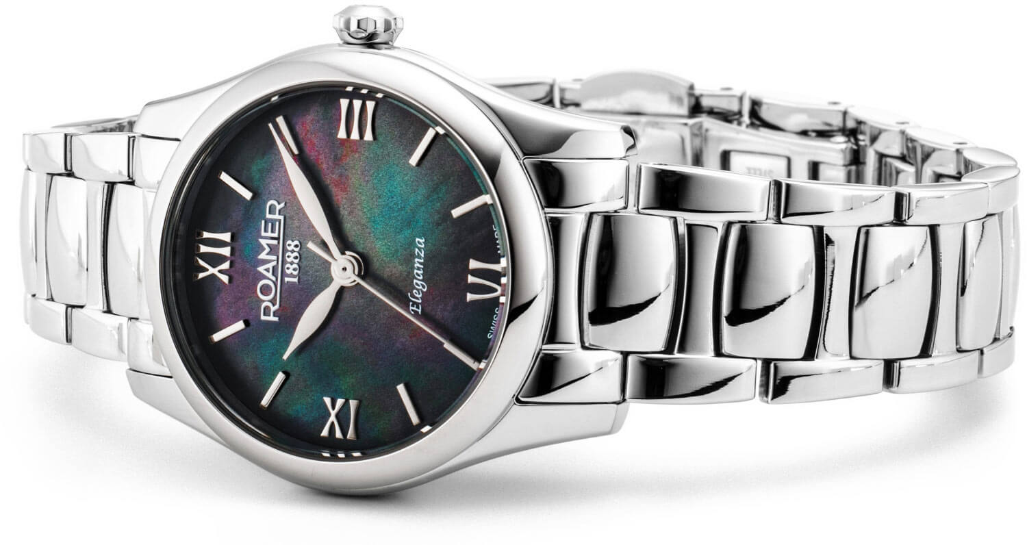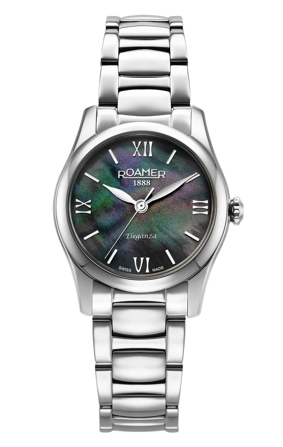 Model je postaven na precizním švýcarském strojku Ronda, umístěném v drobném, 30milimetrovém pouzdře z ušlechtilé oceli. Číselník z pravé perleti dodává modelu jedinečný charakter a každému kusu zajišťuje unikátní vzhled – neexistují dva identické exempláře. Na ploše ciferníku se nacházejí klasické římské číslice, liniové indexy a štíhlé ručky, které ladí s oblým tvarem pouzdra. Celek chrání safírové sklíčko, odolné proti poškrábání a zajišťující výtečnou čitelnost. Roamer Eleganza jsou hodinky, které spojují hodinářskou preciznost s citem pro ženský detail – bez zbytečných ozdob, ale s plným vědomím formy.