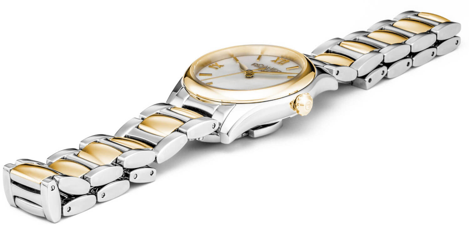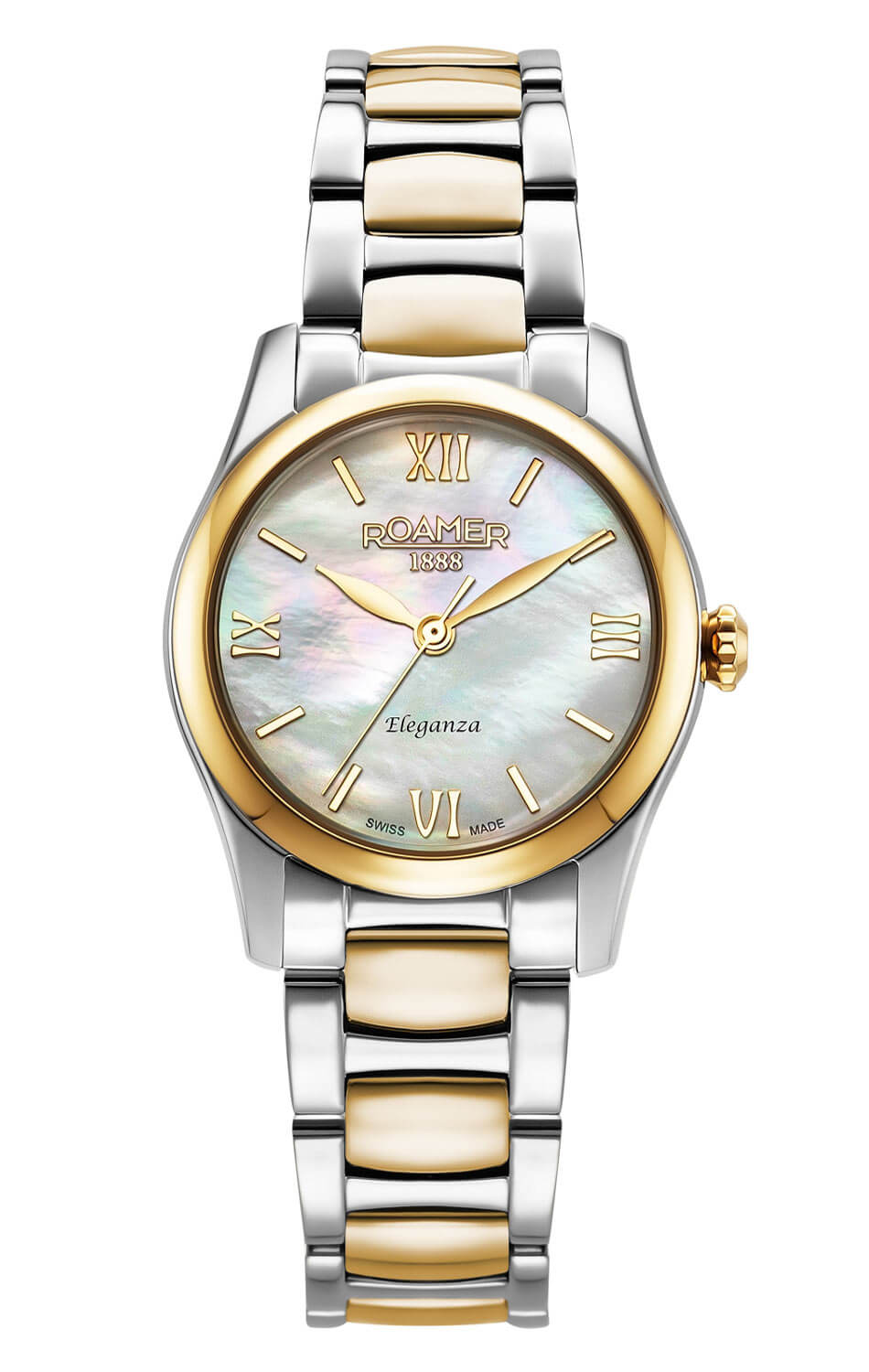 Model je postaven na přesném švýcarském strojku Ronda, umístěném v malé 30mm pouzdru z ušlechtilé oceli. Ciferník z přírodní perleti nedodává modelu jen výjimečný charakter, ale také každému kusu zaručuje unikátní vzhled – neexistují dva totožné exempláře. Na ploše číselníku se nacházejí klasické římské číslice, čárkové indexy a štíhlé ručky, které ladí s oblými liniemi pouzdra. Celý ciferník chrání safírové sklo, odolné proti poškrábání a poskytující výbornou čitelnost. Roamer Eleganza jsou dvoubarevné hodinky na náramku, které spojují hodinářskou přesnost s citem pro ženský detail – bez zbytečností, ale s plným vědomím formy.