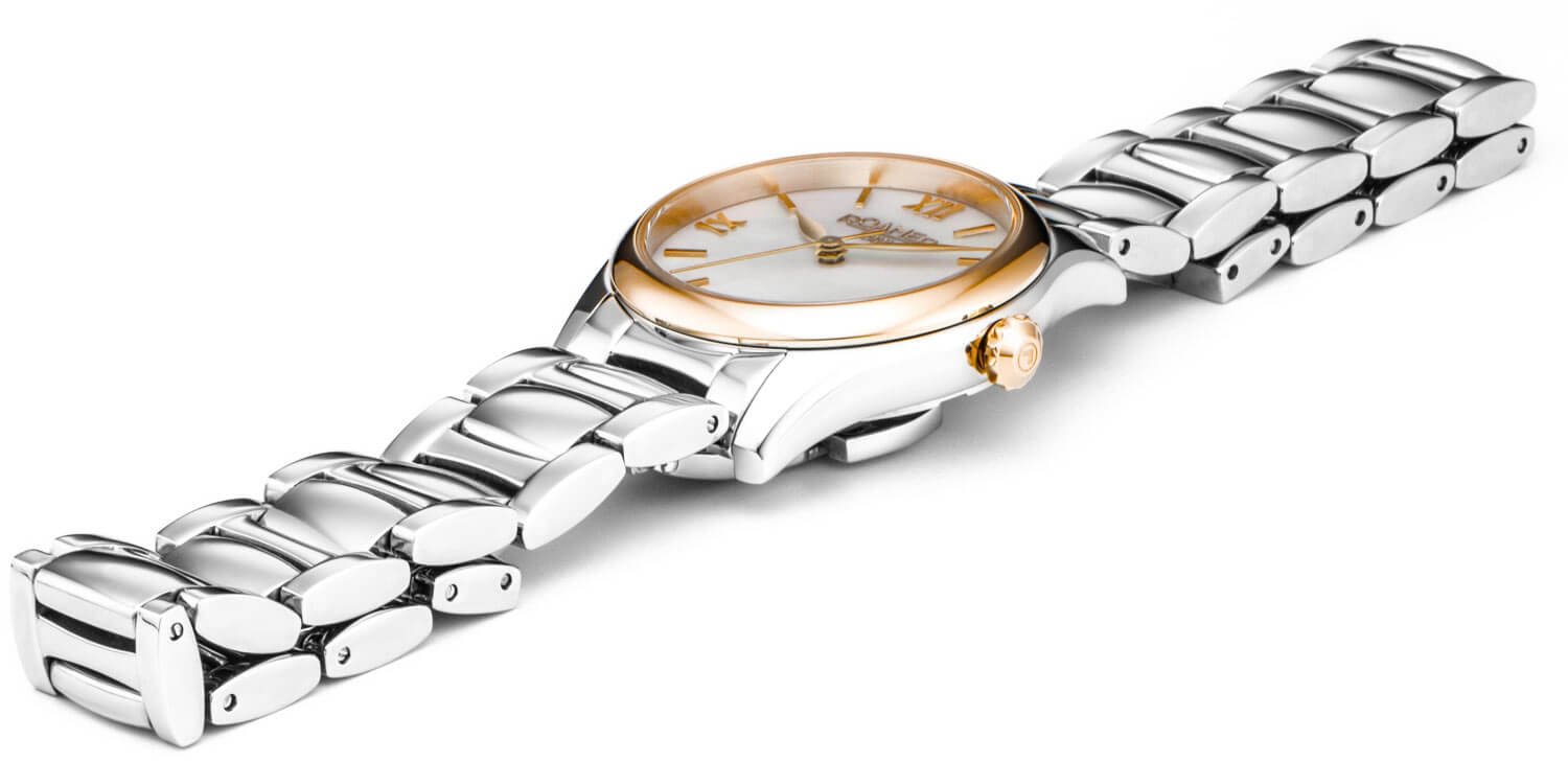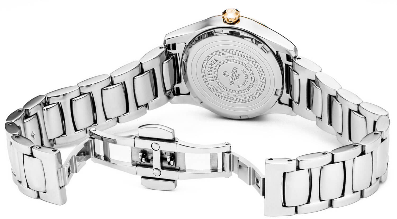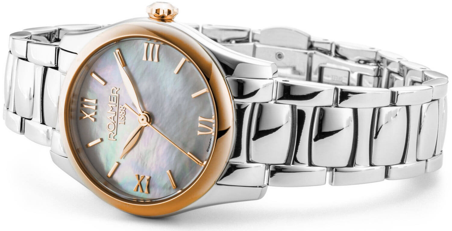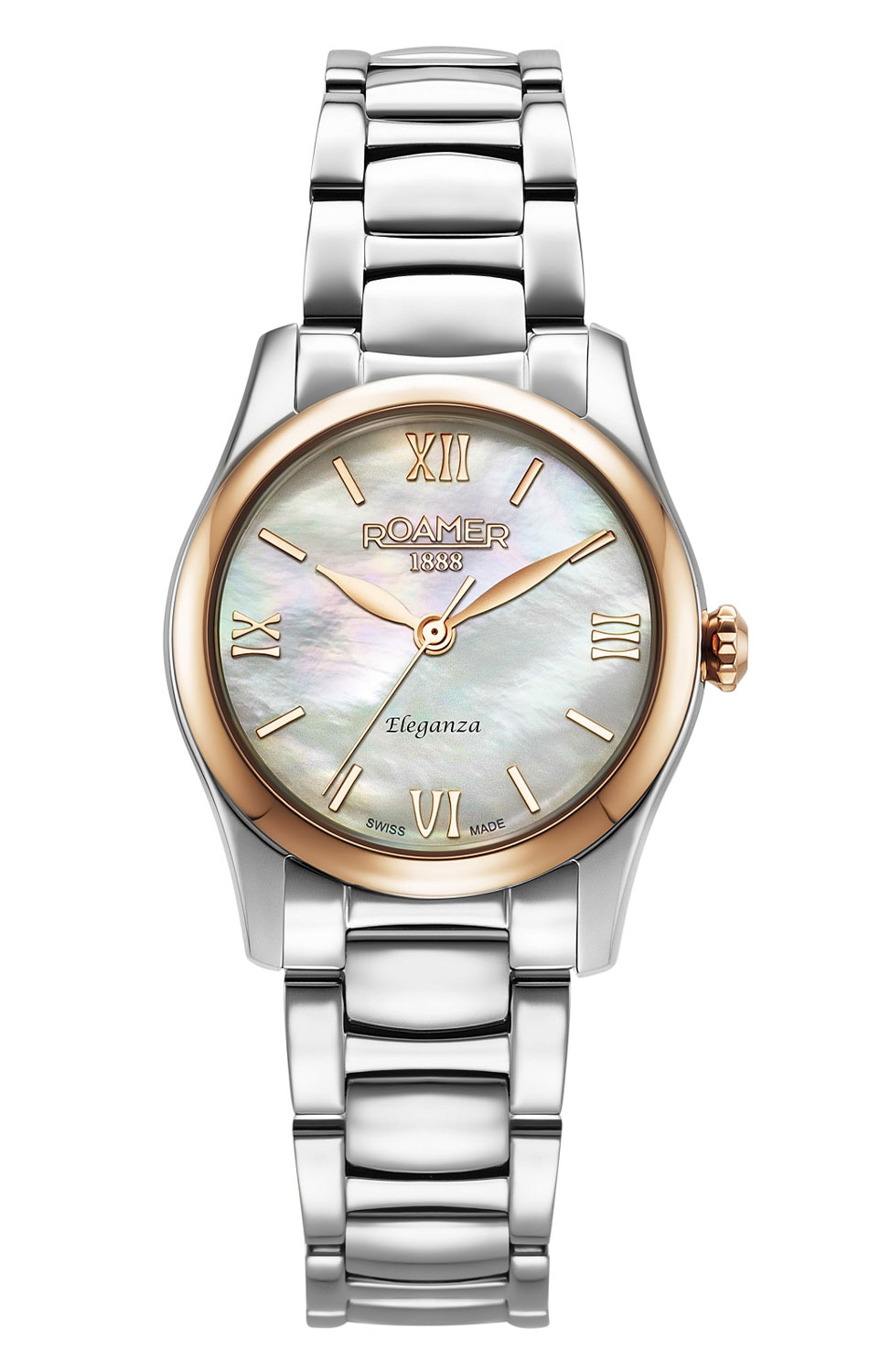 Model je postaven na přesném švýcarském strojku Ronda, umístěném v malé, 30mm pouzdru z ušlechtilé oceli. Ciferník z přírodní perleti nedodává modelu jen výjimečný charakter, ale také každému kusu zaručuje unikátní vzhled – neexistují dva totožné exempláře. Na ploše číselníku se nacházejí klasické římské číslice, čárkové indexy a štíhlé ručky, které ladí s oblými liniemi pouzdra. Celý ciferník chrání safírové sklo, odolné proti poškrábání a poskytující výbornou čitelnost. Roamer Eleganza jsou dvoubarevné hodinky na náramku, které spojují hodinářskou přesnost s citem pro ženský detail – bez zbytečností, ale s plným vědomím formy.