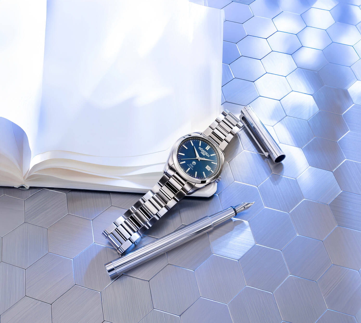 Největší dojem však zanechává ciferník – v modrém odstínu se jemně leskne ve světle a dodává celku výjimečný charakter. Indexy a ručky klasického tvaru zajišťují výbornou čitelnost a malé okénko s datem na třetí hodině doplňuje funkčnost modelu. Uvnitř pracuje švýcarský automatický strojek Soprod P024 s 38hodinovou rezervou chodu, ceněný pro svou spolehlivost a kultivovaný chod. Hodinky v sadě Roamer Automatic 970983 41 45 20 na náramku jsou harmonickým spojením inženýrské preciznosti a jemné estetiky – vytvořené pro ty, kteří si cení kvality, stylu a autentičnosti.