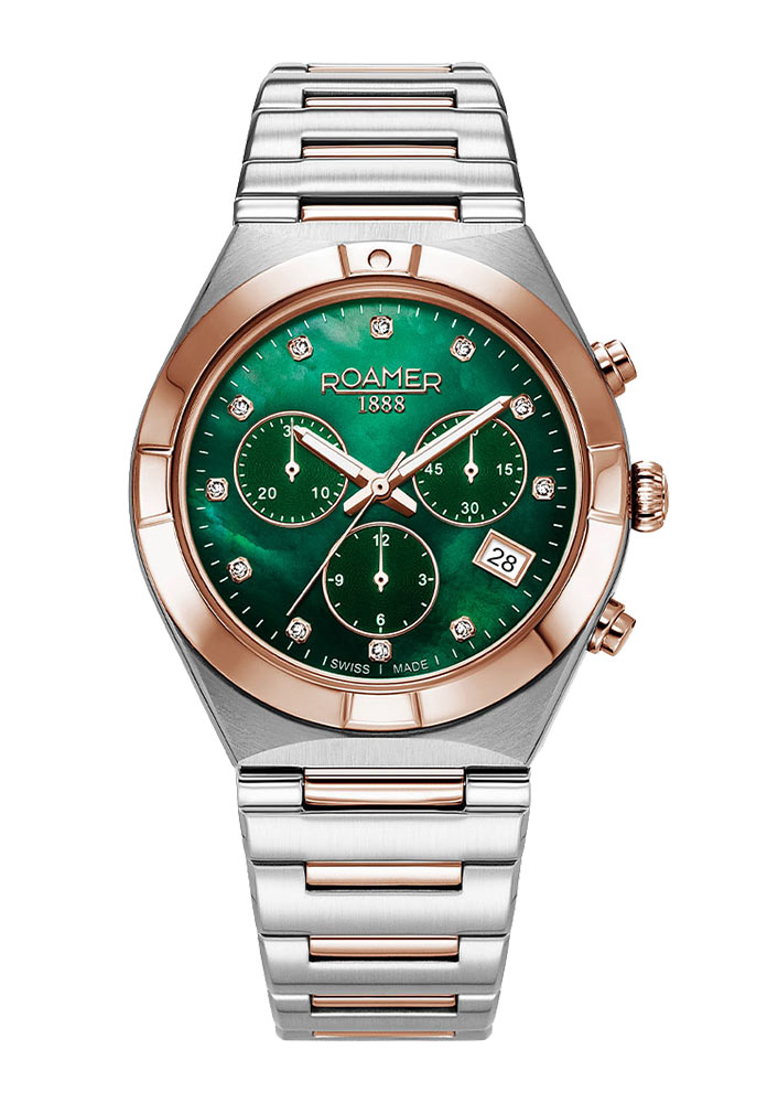 Safírové sklíčko extrémně tvrdé a těžko poškrábatelné chrání bohatý ciferník. Nádherný, poutavý a vzorově jedinečný číselník je vyroben z perleti. Aktuální čas lze odečítat díky pozlaceným ručkám a indexům v podobě jiskřivých krystalů na celých hodinových bodech. Na ručičkách je svítící hmota, která usnadní odečítání času ve ztížených světelných podmínkách. Mimořádně užitečnou funkcí představeného modelu Roamer je sportovní chronograf. Tato funkce vám díky speciálním subciferníkům umožní změřit přesný čas například kola během závodu. Na čtyři hodiny výrobce umístil datumové okno s aktuálním dnem v měsíci. Celý design doprovází hrdé logo švýcarské značky Roamer na pozici dvanácté hodiny.