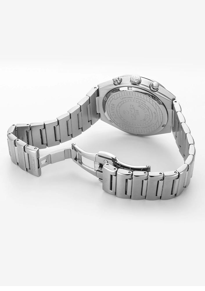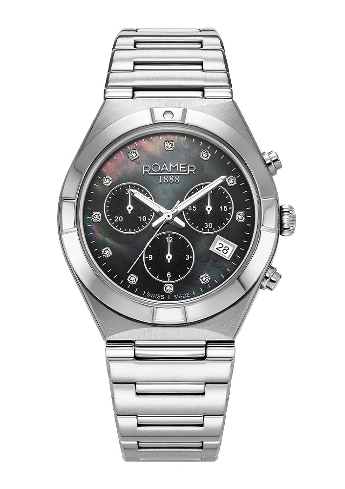 Safírové sklíčko, extrémně tvrdé a těžko poškrábatelné, chrání bohatě zdobený ciferník. Ohromující, poutavý a svým designem jedinečný ciferník je vyroben z perleti. Aktuální čas lze odečíst díky přehledným ručkám a indexům v podobě lesklých krystalů na celých hodinových bodech. Na ručičkách je svítící hmota, která usnadňuje odečítání času ve ztížených světelných podmínkách. Mimořádně užitečnou funkcí představeného modelu Roamer je sportovní chronograf. Tato funkce vám díky speciálním subciferníkům umožní měřit přesný čas, například kolo během závodu. Na čtyři hodiny umístil výrobce datumové okno s aktuálním dnem v měsíci. Celý projekt provází ve 12 hodin hrdé logo švýcarské značky Roamer.