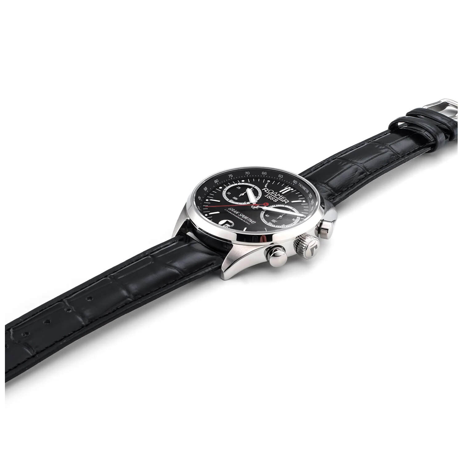 Sportovní hodinky Roamer 978818418520 jsou uzavřeny v elegantním ocelovém pouzdře o průměru 42 mm, které kombinuje saténové a leštěné plochy, čímž celému vzhledu dodává rafinovaný charakter. Na pravé straně pouzdra se nachází velká, značková korunka s logem značky a dva tlačítka chronografu. Zadní část hodinek zdobí šroubovací zadní víko s nápisem „GRAN SPORTIVO“, charakteristickými prvky značky a motivem mřížky, který dodává sportovní vzhled. Díky šroubovacímu víku dosahují hodinky vodotěsnosti až do 100 metrů, což je činí ideálními jak pro každodenní nošení, tak pro výjimečné příležitosti. Leštěná luneta obklopuje safírové sklo s antireflexní vrstvou. Hodinky jsou vybaveny ocelovým náramkem s tříúrovňovým nastavením a černým koženým řemínkem ladícím s ciferníkem, který je opatřen přezkou zdobenou logem Roamer. Výrobce dbal na komfort uživatele a nabízí systém rychlé výměny řemínku, což je určitě významný přínos.