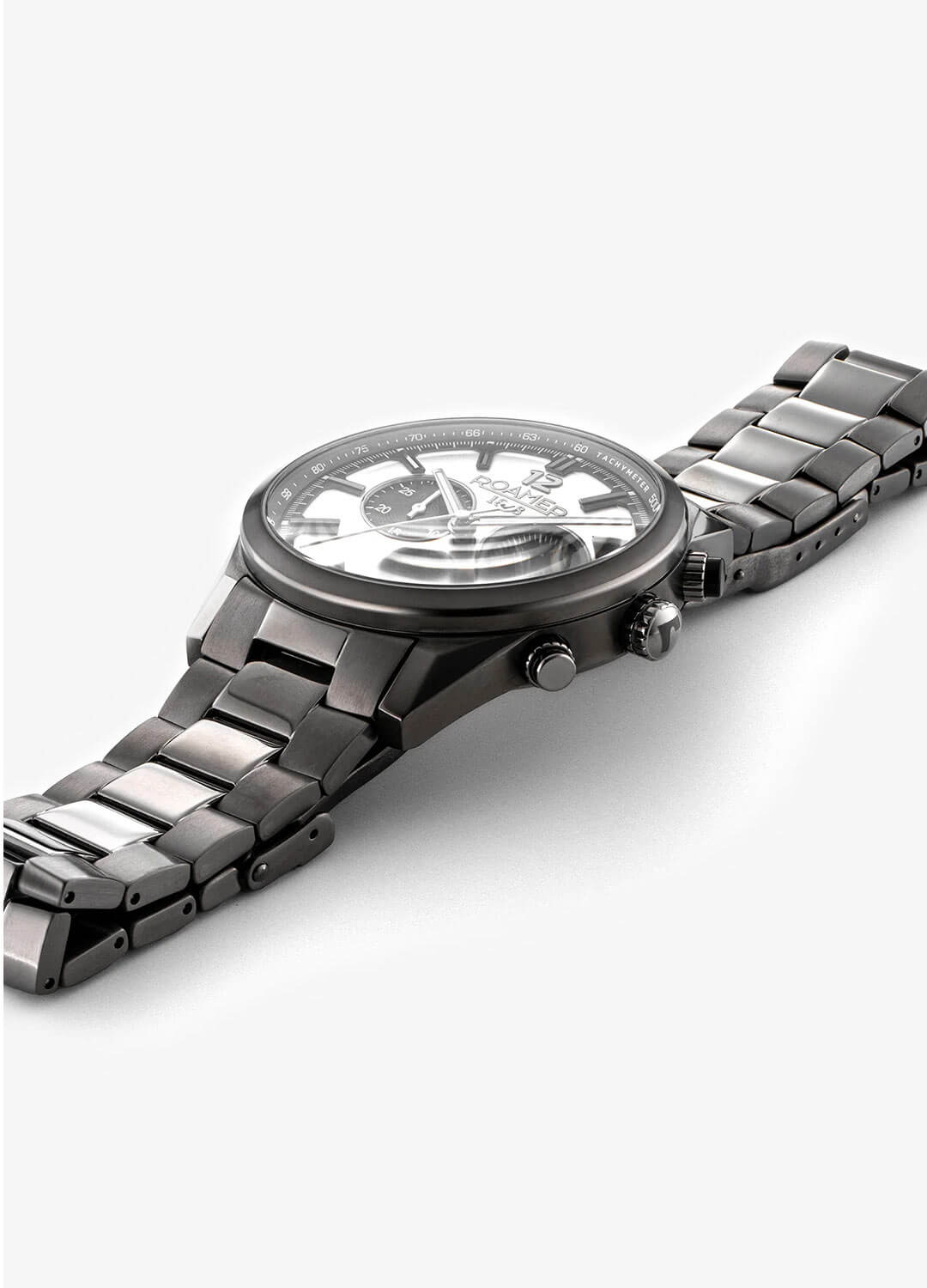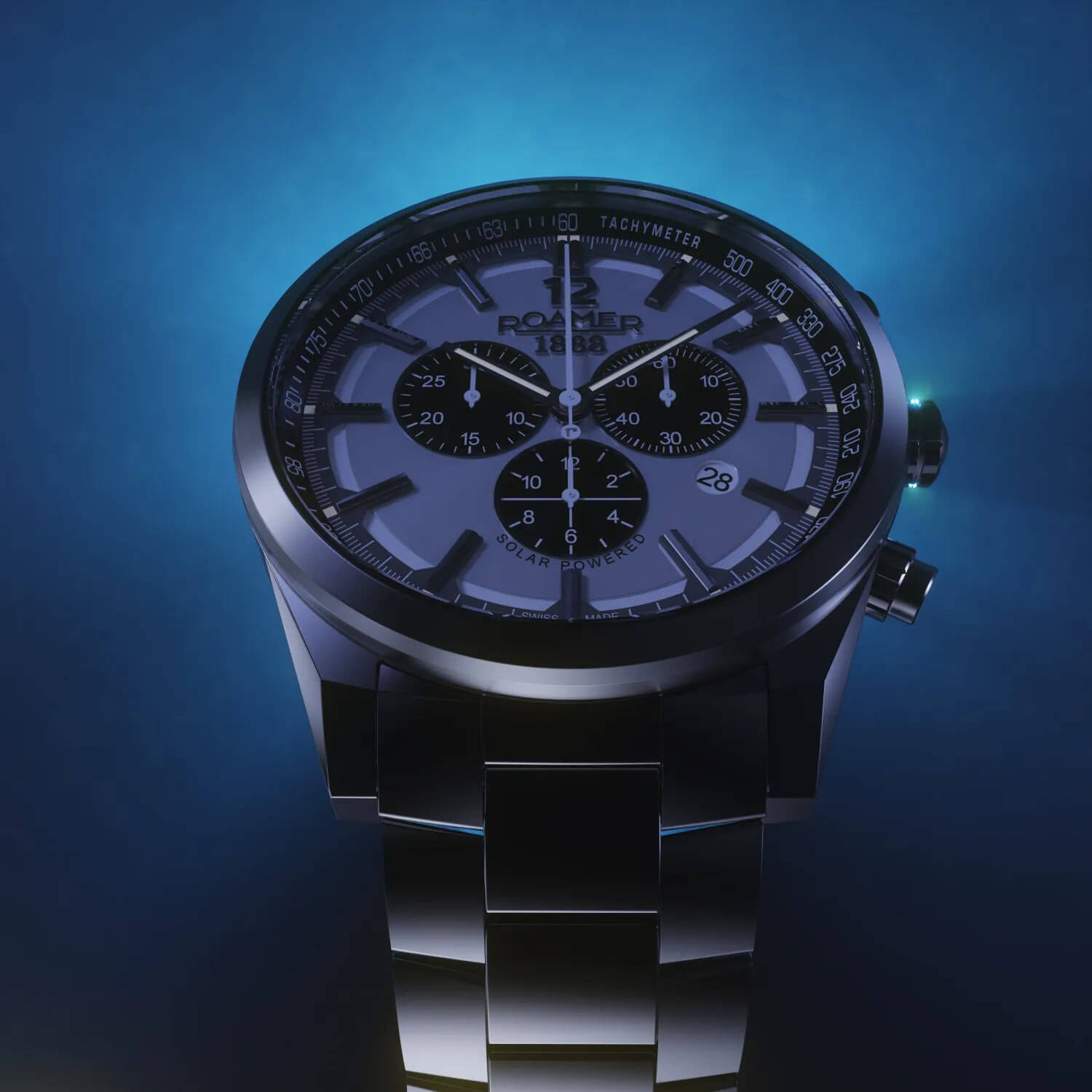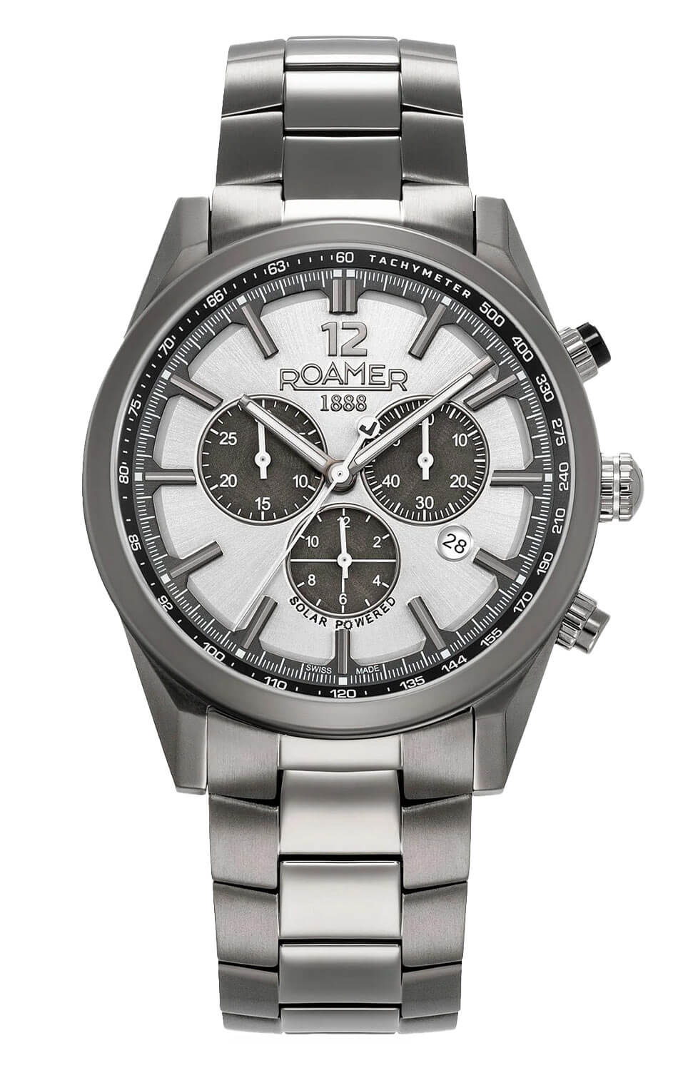 Srdcem tohoto modelu je švýcarský solární strojek Ronda Swiss Made „Solar Powered“, který zaručuje přesný chod bez nutnosti pravidelné výměny baterie. Hodinky Roamer zaujmou intenzivně stříbrným ciferníkem, který skvěle kontrastuje se světlými indexy a ručkami. Na ciferníku se nacházejí speciální subciferníky chronografu, které umožňují přesné měření času – ideální jak pro každodenní použití, tak i při sportovních aktivitách. Výrobce vybavil tento model také tachymetrickou stupnicí, která slouží k měření rychlosti pohybu na vzdálenost 1 km. Praktickým doplňkem je okénko s datem na pozici čtvrté hodiny, které informuje o aktuálním dni v měsíci. Díky luminiscenčním prvkům Superluminal zůstává ciferník čitelný i za zhoršených světelných podmínek.