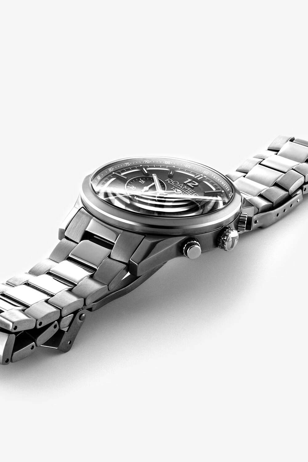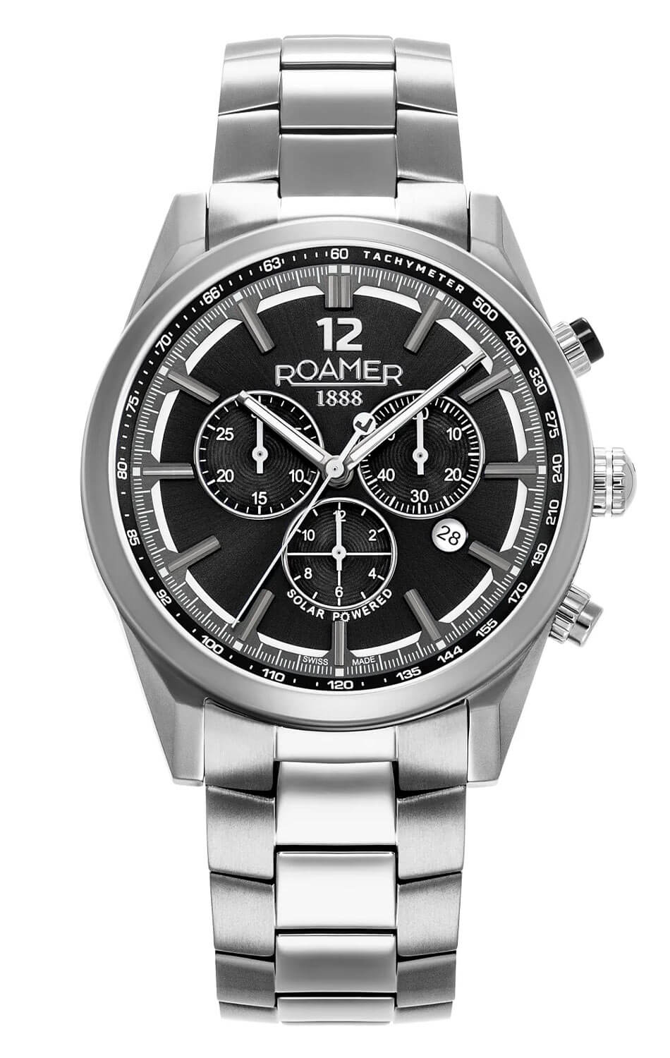 Srdcem tohoto modelu je švýcarský solární strojek Ronda Swiss Made „Solar Powered“, který zaručuje přesný chod bez nutnosti pravidelné výměny baterie. Hodinky Roamer zaujmou intenzivně šedým ciferníkem, který skvěle kontrastuje se světlými indexy a ručkami. Na ciferníku se nacházejí speciální subciferníky chronografu, které umožňují přesné měření času – ideální jak pro každodenní použití, tak i při sportovních aktivitách. Výrobce vybavil tento model také tachymetrickou stupnicí, která slouží k měření rychlosti pohybu na vzdálenost 1 km. Praktickým doplňkem je okénko s datem na pozici čtvrté hodiny, které informuje o aktuálním dni v měsíci. Díky luminiscenčním prvkům Superluminal zůstává ciferník čitelný i za zhoršených světelných podmínek.
