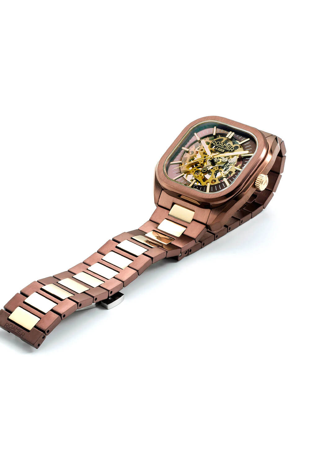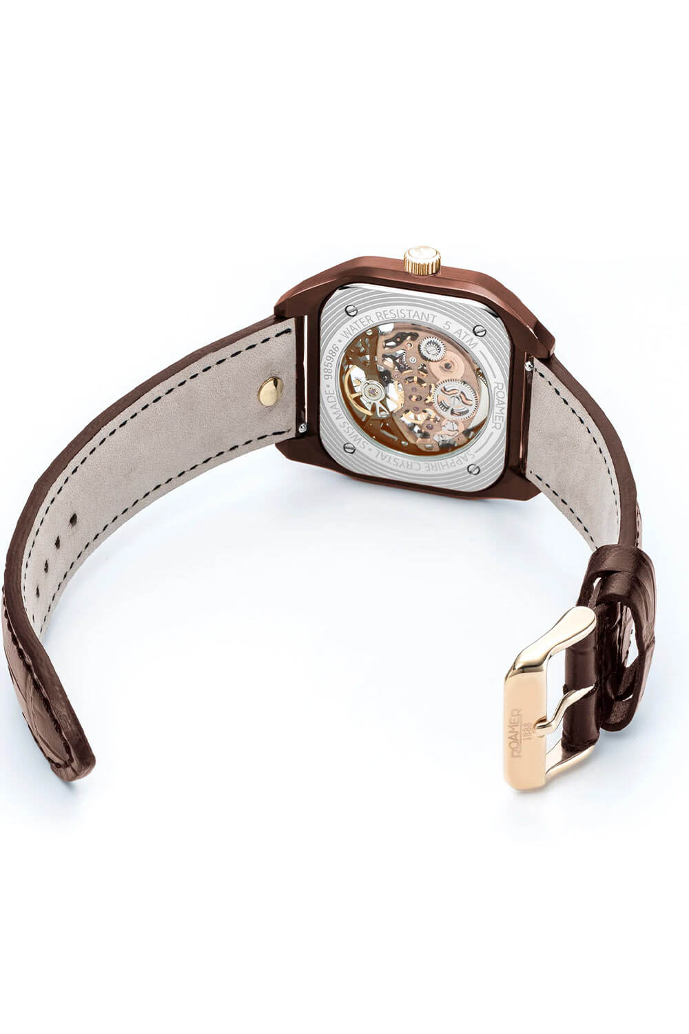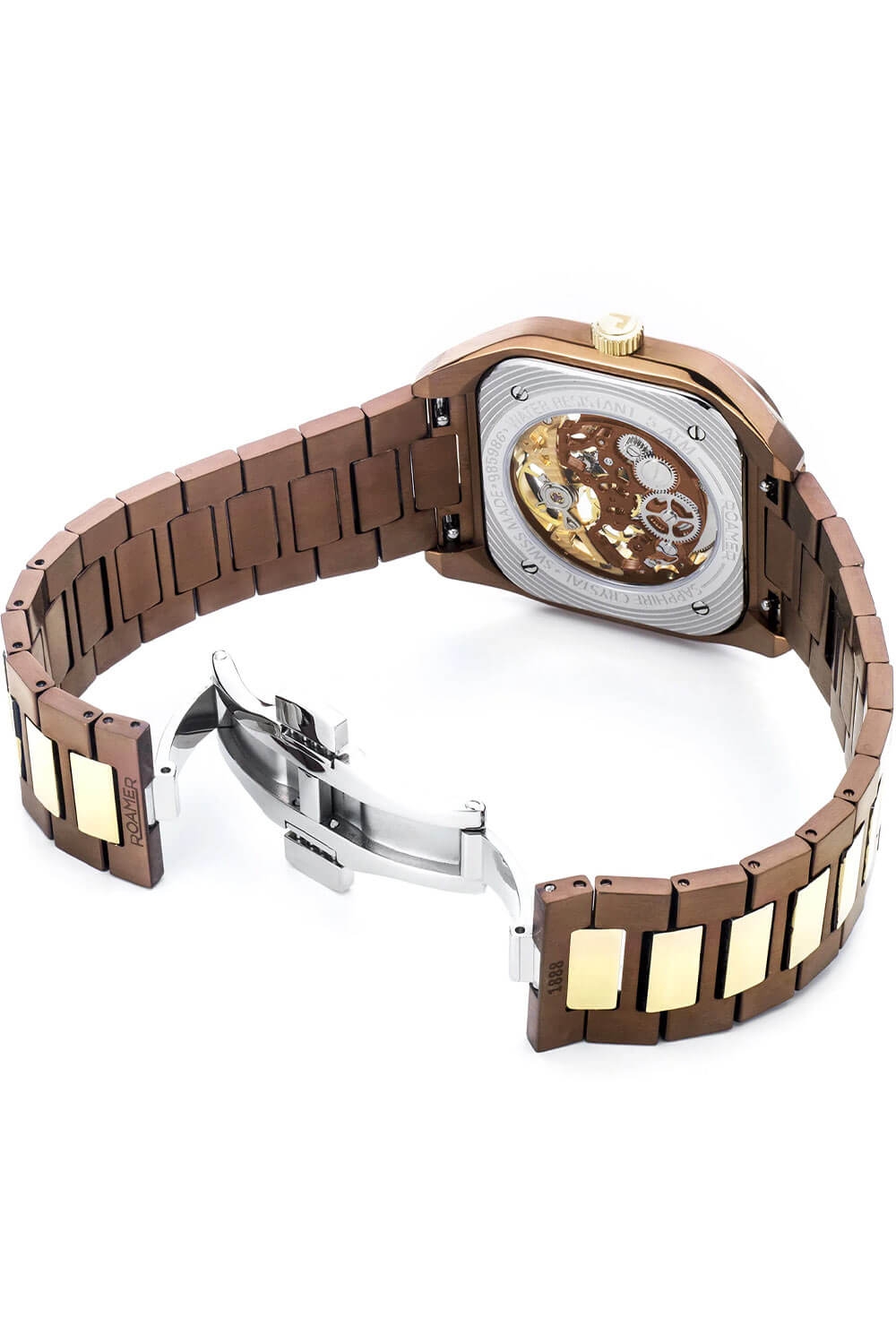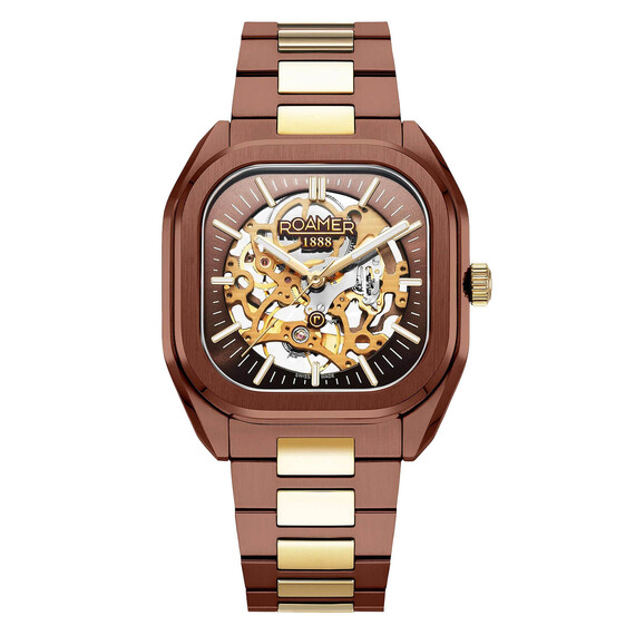 Elegantní hranaté pouzdro s hnědou IP úpravou a jemně zaoblenými rohy společně s náramkem v hnědé barvě s články v růžově zlatém IP tónu vytváří harmonický celek. Švýcarské hodinky Roamer Mechano 985986436520 jsou zároveň mimořádně praktické – součástí balení je i vysoce kvalitní kožený řemínek s ražbou, který lze díky systému „easy-change“ bleskově vyměnit. To umožňuje přizpůsobit hodinky každé příležitosti a dát jim zcela nový charakter. Pánský model Roamer Mechano spojuje klasiku, funkčnost a moderní všestrannost. Zadní víko mechanických hodinek Roamer je průhledné, což umožňuje obdivovat chod skeletonového strojku.