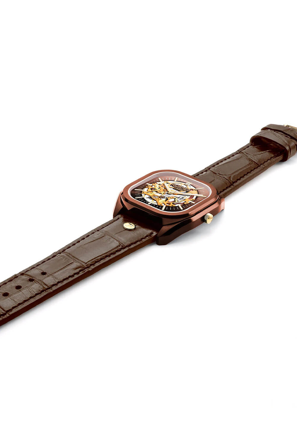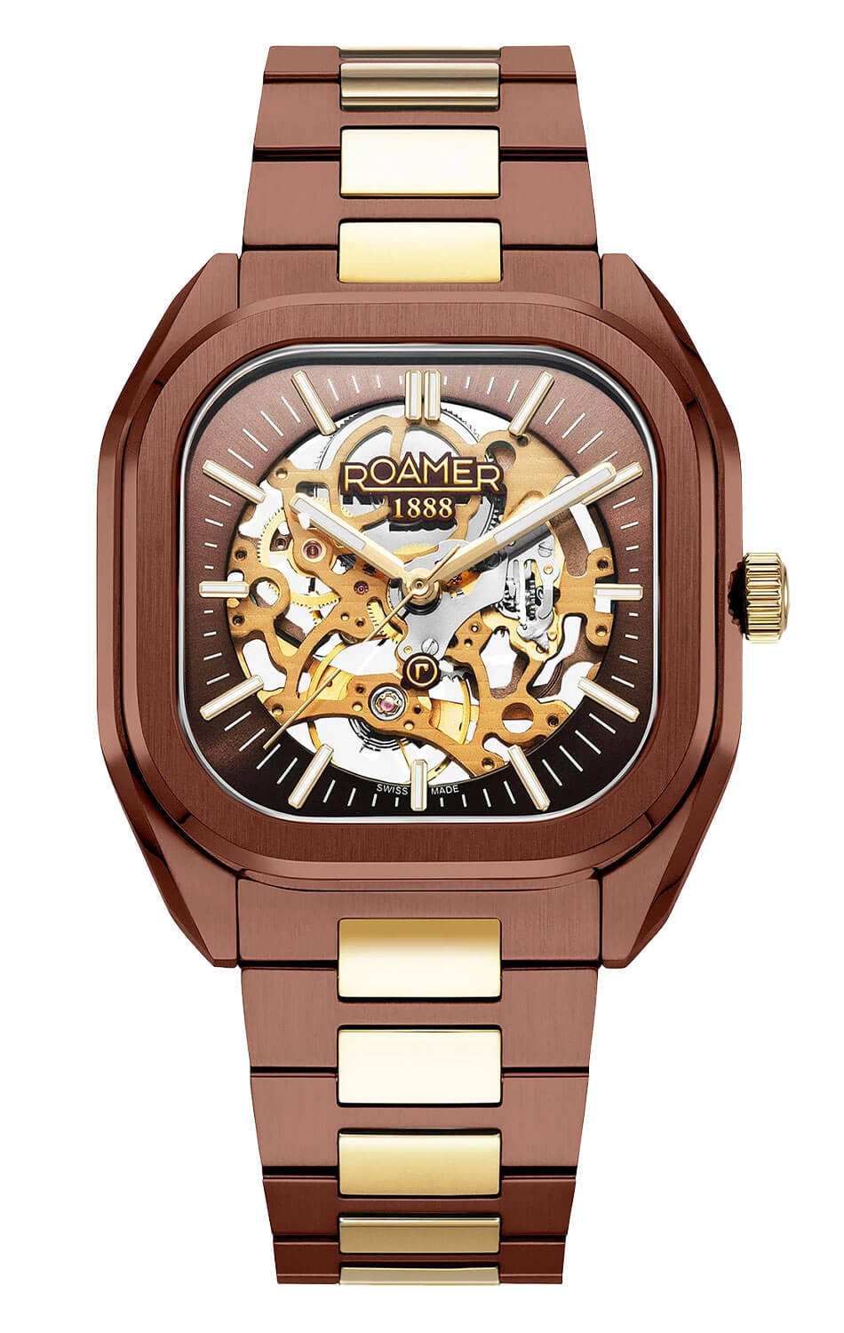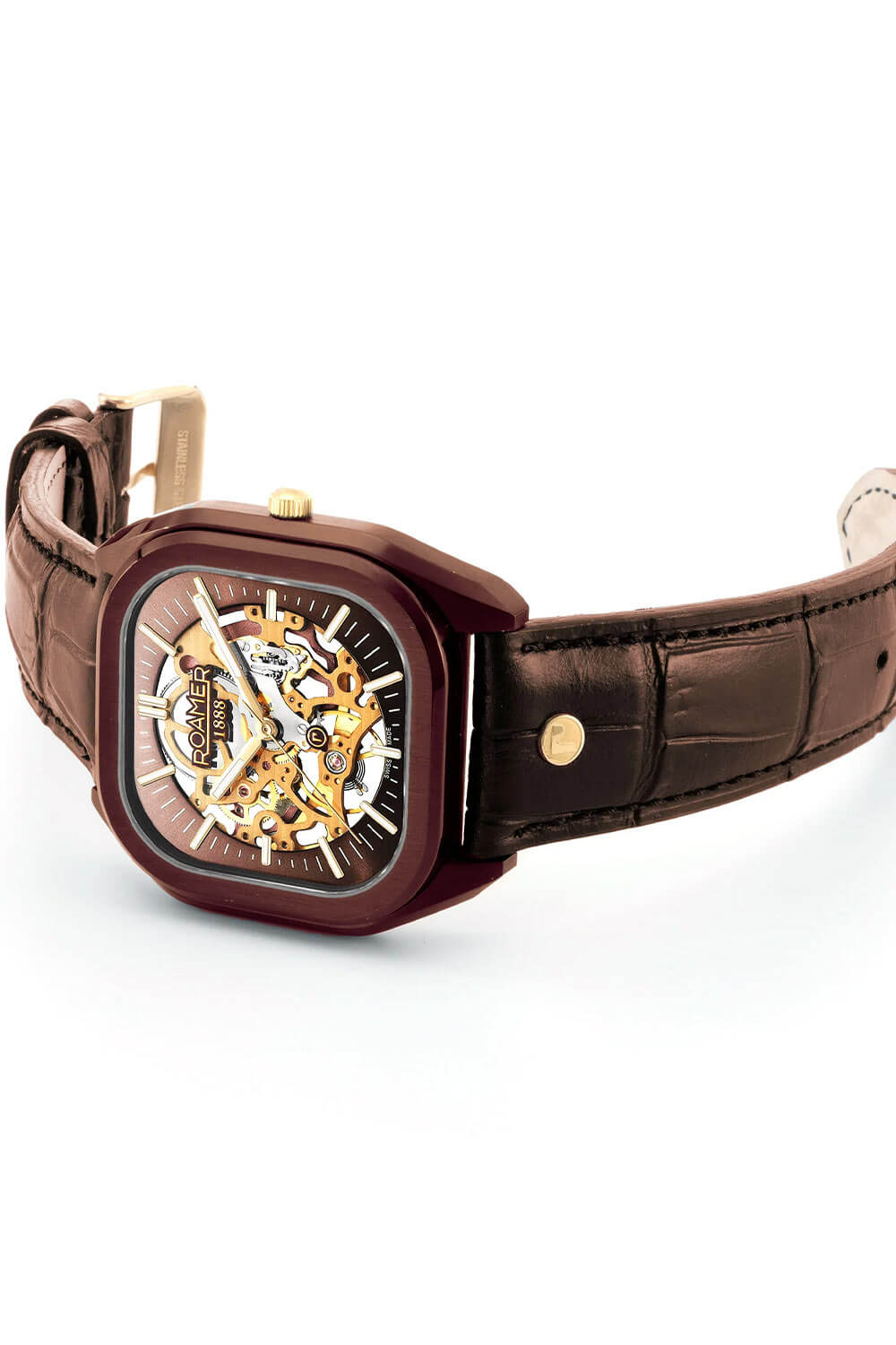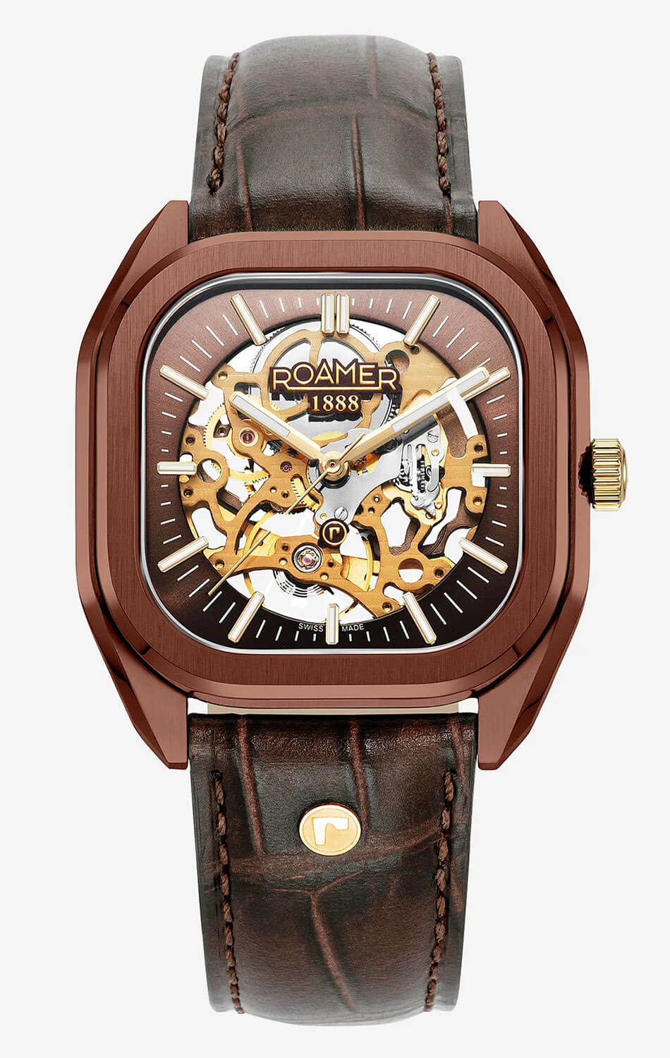 Elegantní hranaté pouzdro s hnědou IP úpravou a jemně zaoblenými rohy společně s náramkem v hnědé barvě s články v růžově zlatém IP tónu vytváří harmonický celek. Švýcarské hodinky Roamer Mechano 985986436520 jsou zároveň mimořádně praktické – součástí balení je i vysoce kvalitní kožený řemínek s ražbou, který lze díky systému „easy-change“ bleskově vyměnit. To umožňuje přizpůsobit hodinky každé příležitosti a dát jim zcela nový charakter. Pánský model Roamer Mechano spojuje klasiku, funkčnost a moderní všestrannost. Zadní víko mechanických hodinek Roamer je průhledné, což umožňuje obdivovat chod skeletonového strojku.