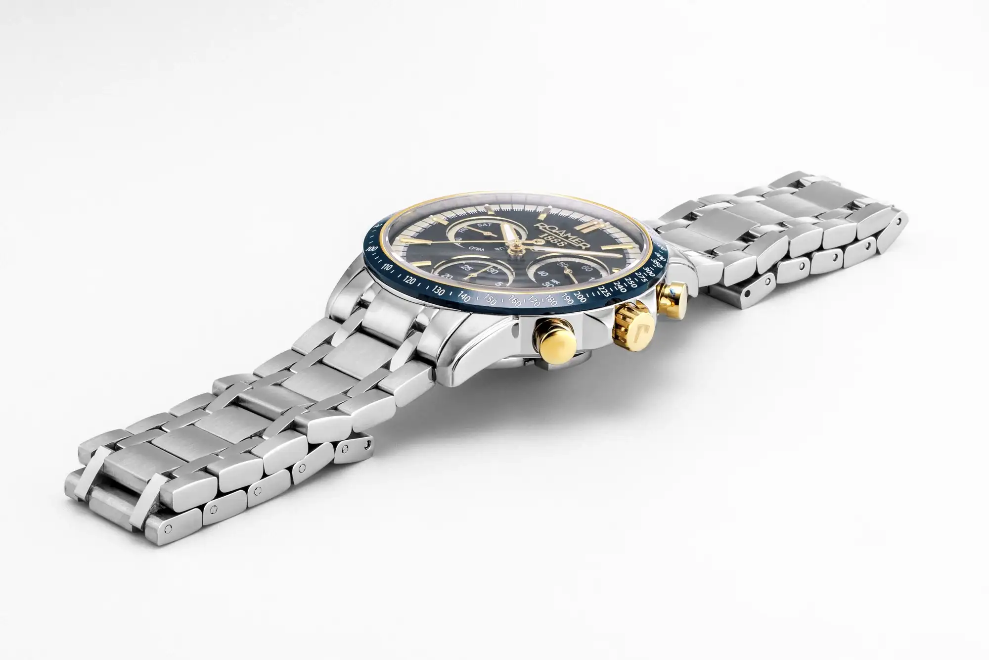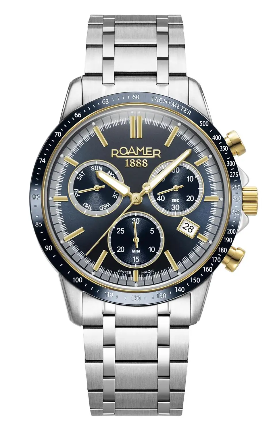 Na ciferníku hodinek Roamer dominuje uspořádání chronografu s přesnými totalizátory minut a sekund, doplněné praktickým ukazatelem dne v týdnu a okénkem data. Tachymetr umožňuje orientační měření rychlosti na základě ujeté vzdálenosti, což je odkazem na milovníky motorismu a dynamických sportů. Tlačítka na pravé straně pouzdra zajišťují rychlý přístup k funkcím stopek a díky vysoké čitelnosti a výrazným indexům je ovládání intuitivní v každé situaci. Celek doplňuje vodotěsnost na úrovni 100 metrů - dostatečná, aby nebylo nutné obávat se náhodného kontaktu s vodou.