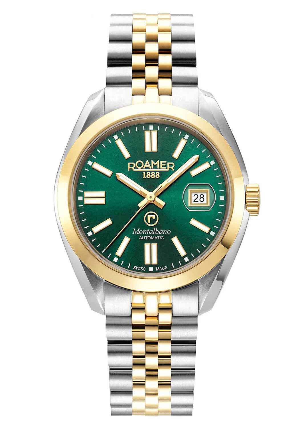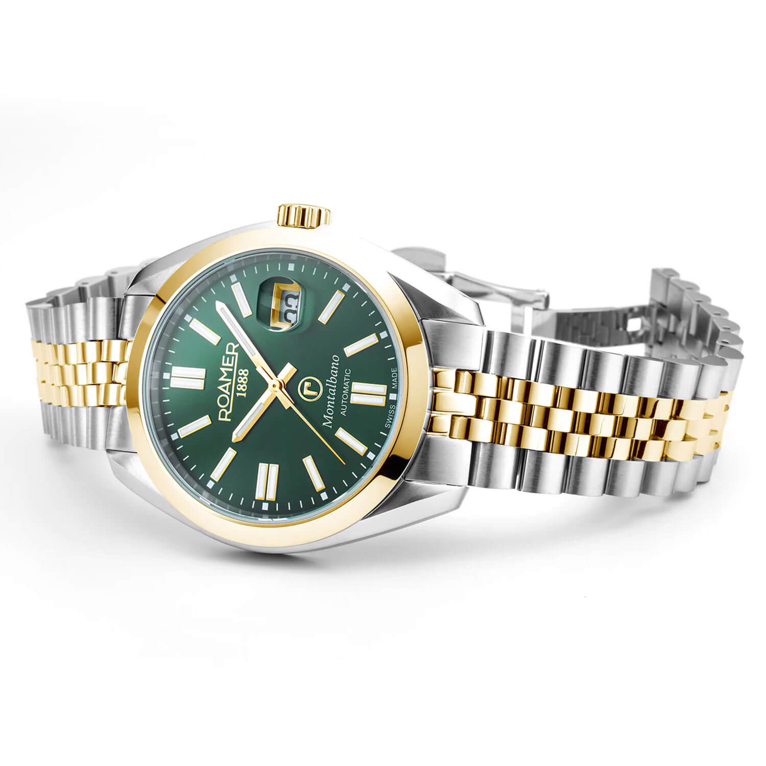 Automatické hodinky Roamer Montalbano Gents 996983 47 75 20 vynikají elegantním ciferníkem v hlubokém odstínu lahvově zelené. Ciferník je zdoben precizně zpracovanými indexy a ručičkami s luminiscenční vrstvou, která zajišťuje výjimečnou čitelnost i při slabém osvětlení. Praktické okénko datumovky umístěné na třetí hodině přidává na funkčnosti a usnadňuje každodenní použití hodinek. Srdcem tohoto modelu je spolehlivý automatický strojek SOPROD P24, který zaručuje přesné měření času a zároveň je dokladem nejvyšší kvality švýcarského hodinářství. Kombinace precizního provedení a sofistikovaného designu činí z hodinek Roamer Montalbano Gents dokonalou volbu pro ty, kteří hledají eleganci a spolehlivost v jednom.